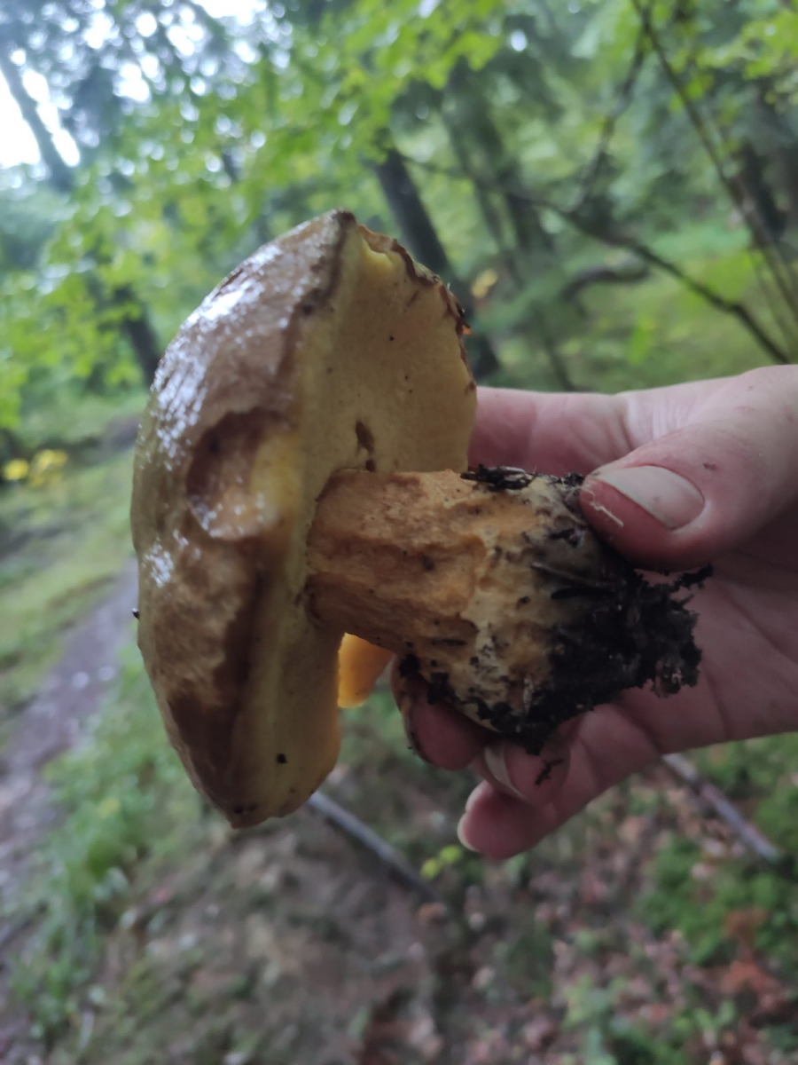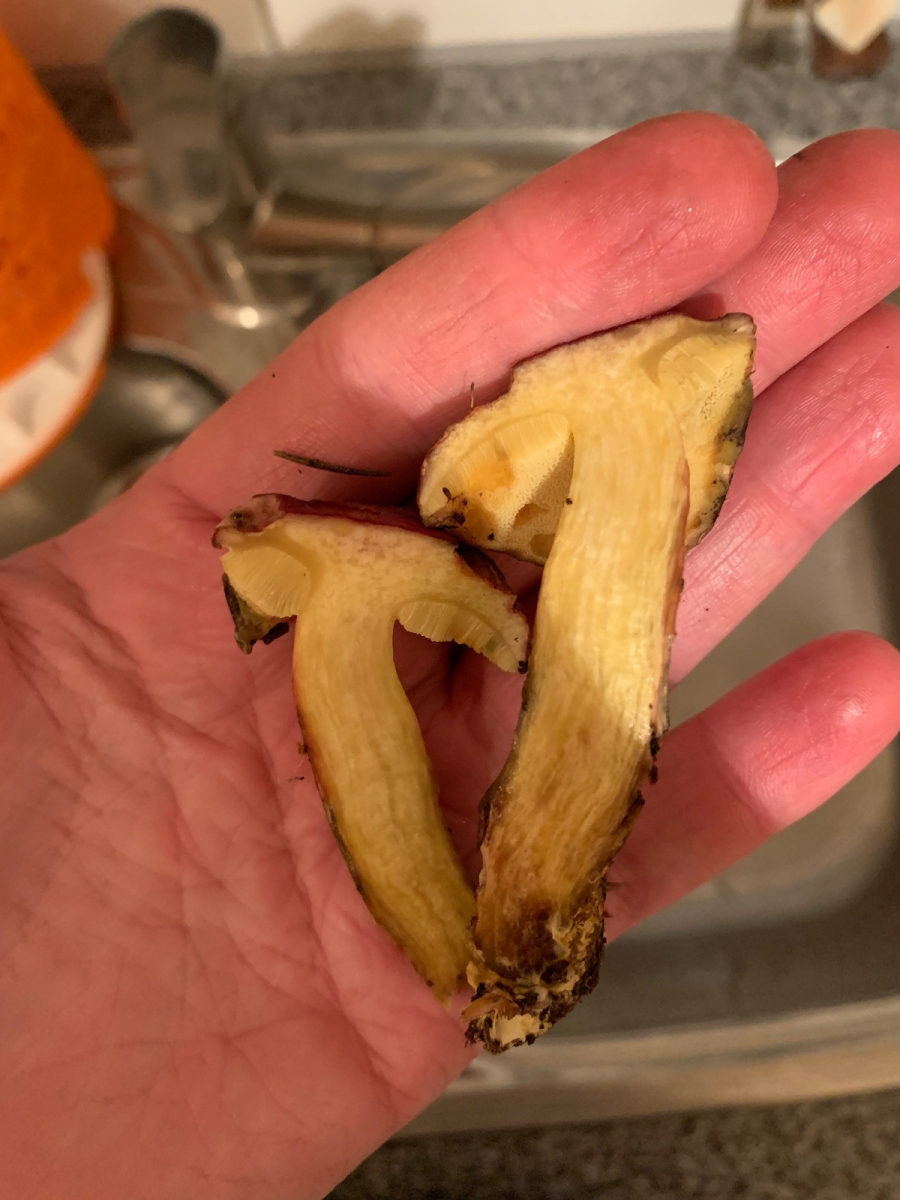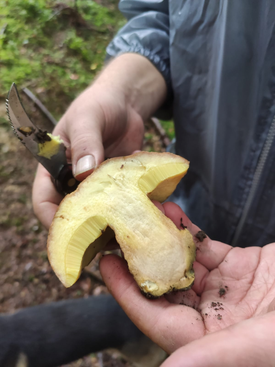 Als Bonus gibts noch diesen Röhrling, denn ich für Butyriboletus subappendiculatus halte, ich habe ihn gepflückt und weggeworfen gefunden und ihn im Wald aufgehängt, dass er sporen kann. Er hatte an der Stielspitze ein gelbliches Netz, dass man auf den Fotos leider nicht sieht.