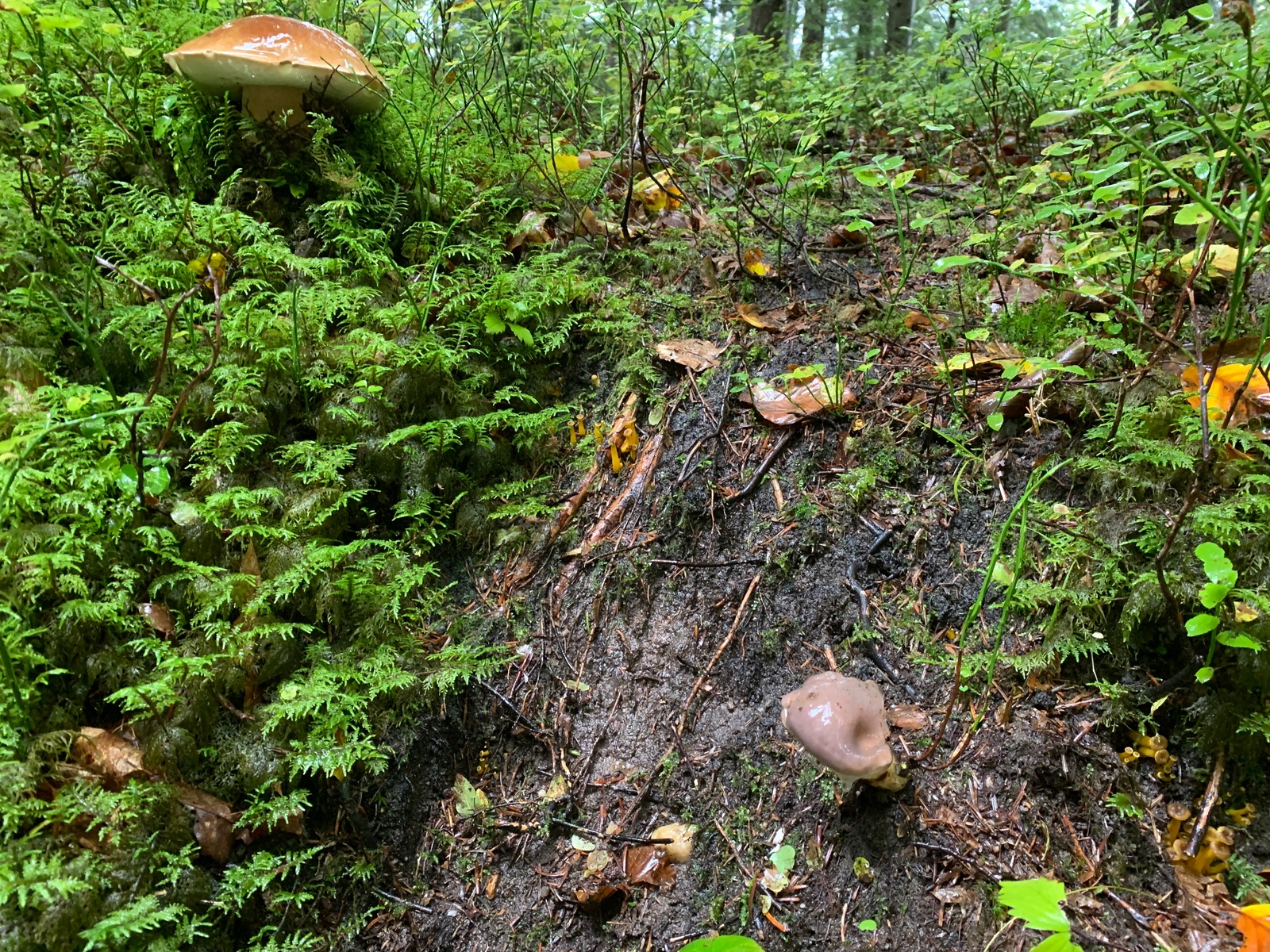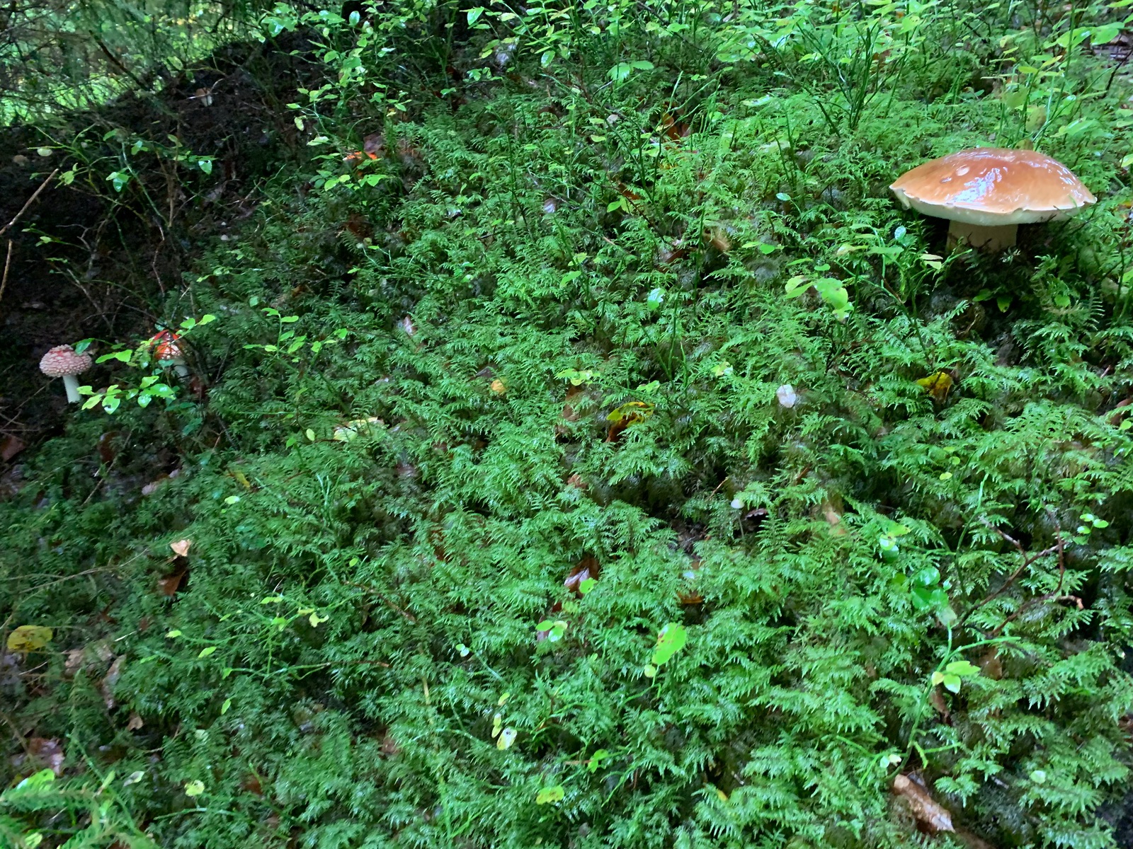 1. Diese Rotkappen. Es ist hauptsächlich ein Fichten/Tannenwald, in fast 20 Metern Entfernung stand aber eine große Birke, eine Espe in etwa 12 Metern. Die Stielbasis ist blaugrünlich verfärbt, das habe ich gelesen soll bei der Birkenrotkappe vorkommen, die Hutfarbe vor allem des jüngeren Exemplares sieht aber recht dunkel für eine Birkenrotkappe aus, die Stielschüppchen sind aber schwärzlich.