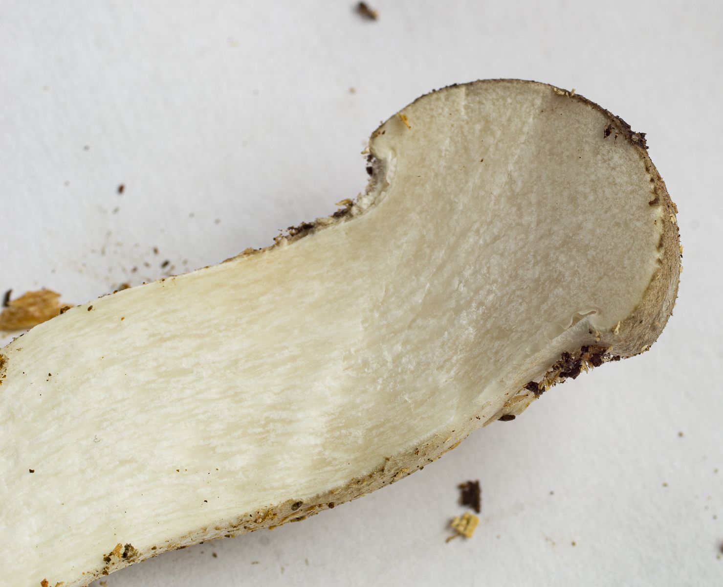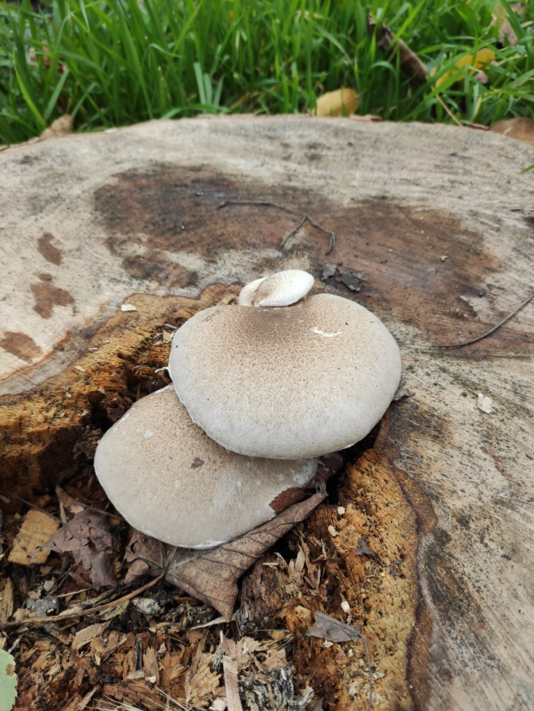 Mir fällt nix anderes ein als ein junger Berindeter Seitling aber ich weiß nicht ob die jung so aussehen dürfen, mit den kaum ausgeprägten Lamellen.