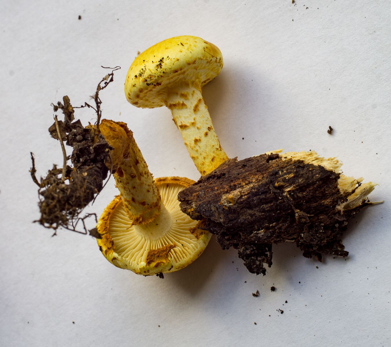 3. 2 einsame Schüpplinge ca. 30cm entfernt voneinander auf kleinen Holzstückchen am Boden wachsend. Nur noch schwach schmierig. Würde ich gerne Pholiota lucifera nennen wollen?