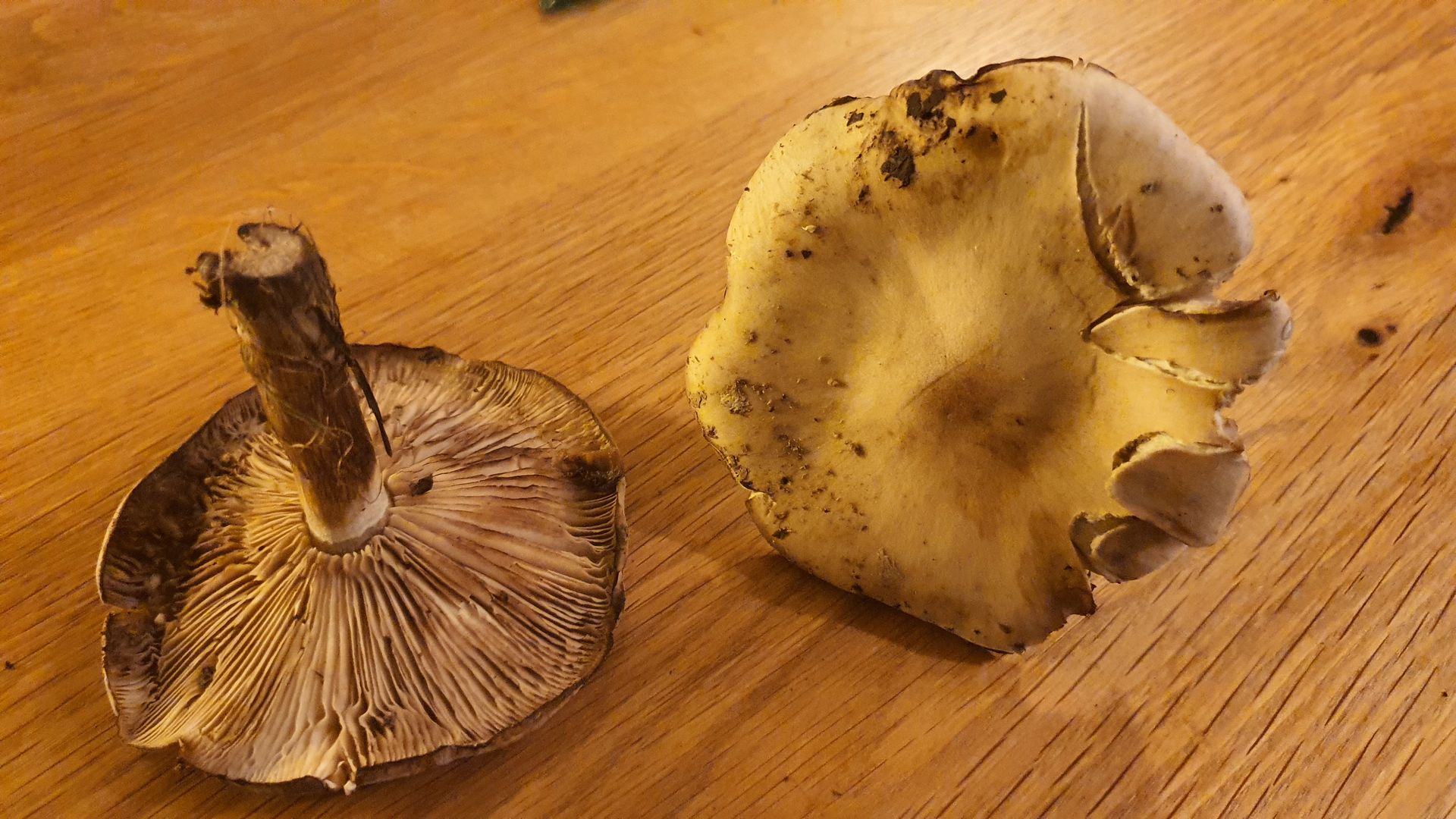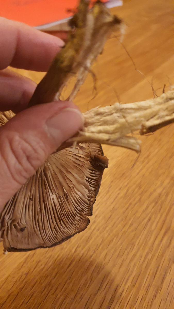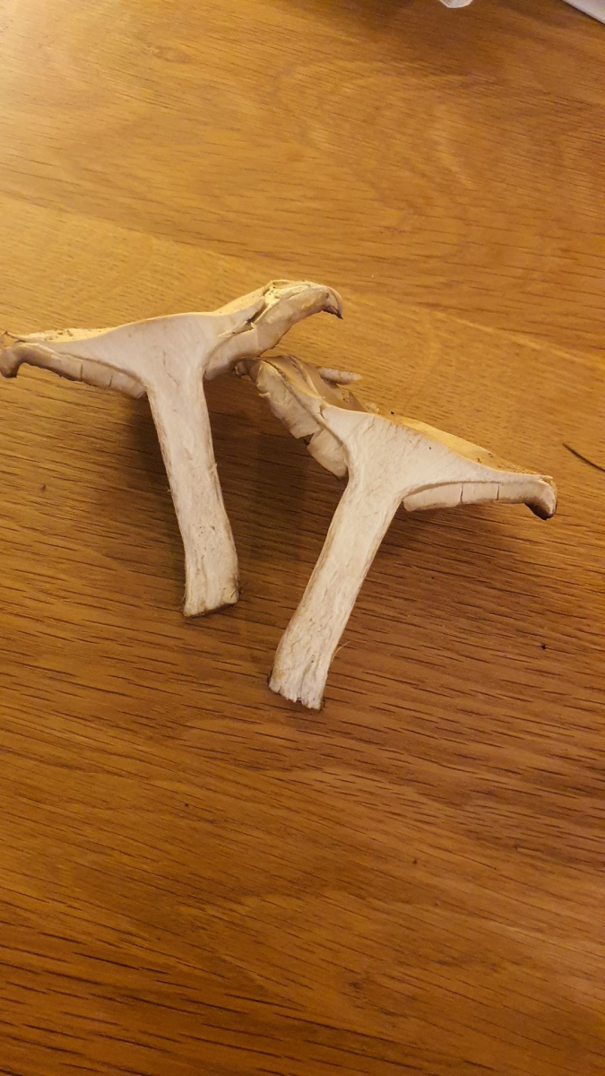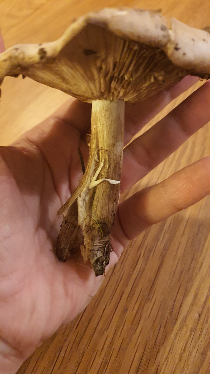 ca. 8cm hoch, weißes Fleisch, Hutedurchmesser ca. 10cm. Stiel freibleibend von Lamellen, keine Querstege. Farbe Hut hellbeige bis weiß, in der Mitte etwas dunkler, leichte Krempe, glatte, leicht samtige Oberfläche. Farbe Stiel war auch hell mit feinen, dunkleren Längsfasern (seit gestern nachgedunkelt). Stiel voll und faserig. Wuchs am Waldrand/ Wiese.