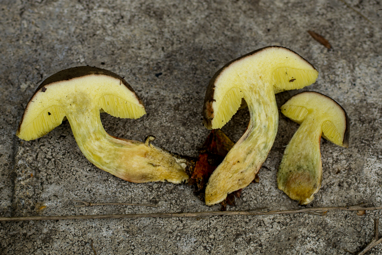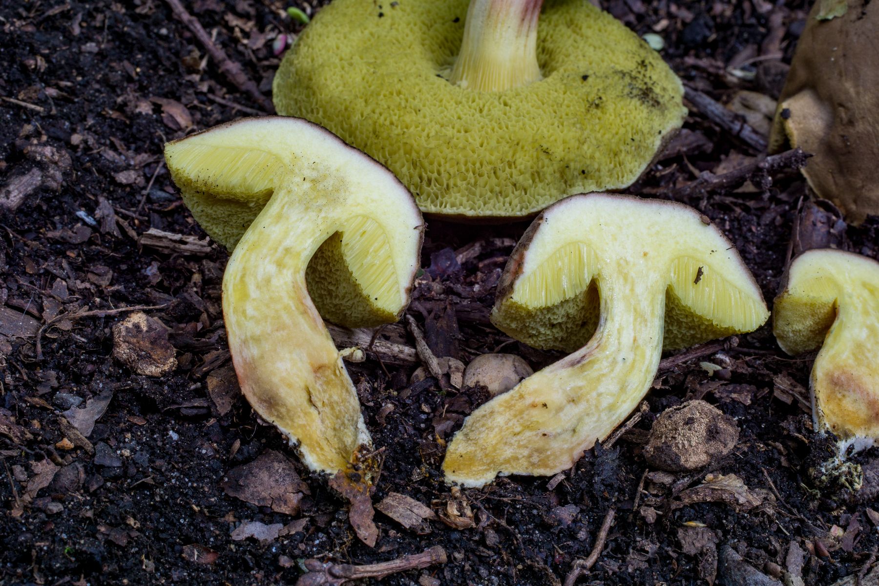 Die hätte ich wegen dem helleren Fleisch und der recht dunklen Stielbasis vielleicht X. chrysenteron genannt, von außen sehen die aber sehr aus wie einige Pilze der ersten Kollektion, also habe ich vermutlich die 1 oder 3 verkehrt benannt oder bei der 1 eine Mischkollektion erwischt?