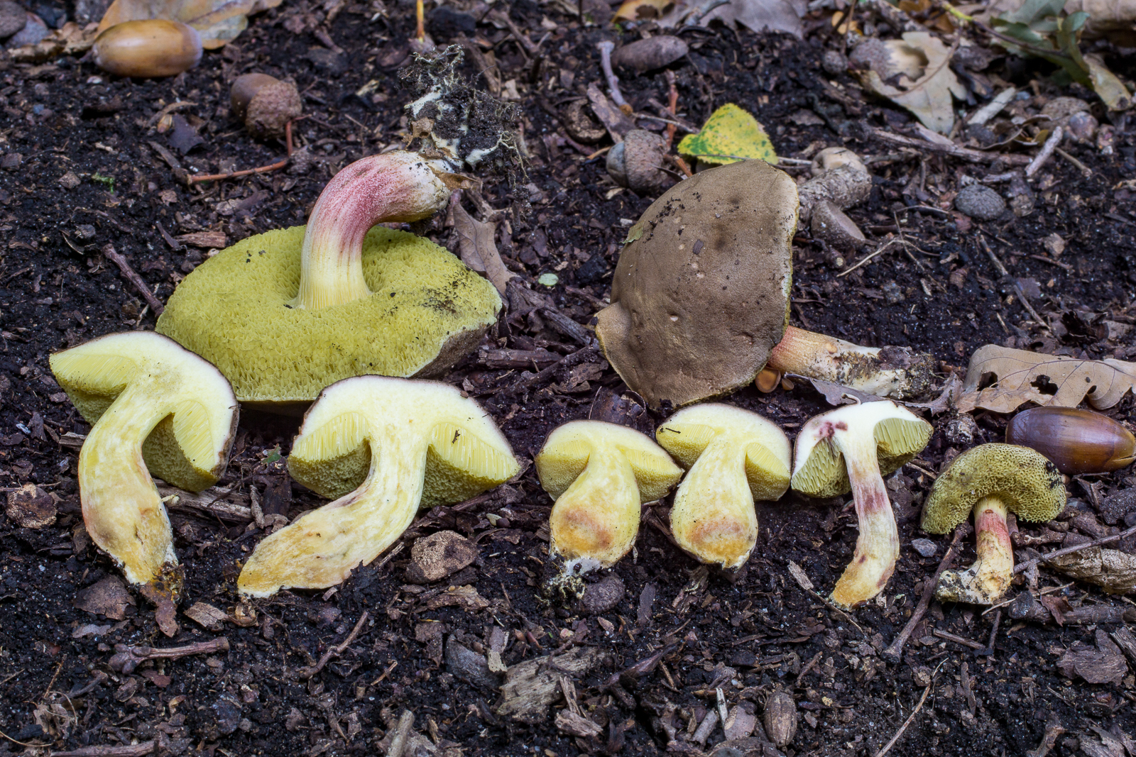 Die hätte ich wegen dem helleren Fleisch und der recht dunklen Stielbasis vielleicht X. chrysenteron genannt, von außen sehen die aber sehr aus wie einige Pilze der ersten Kollektion, also habe ich vermutlich die 1 oder 3 verkehrt benannt oder bei der 1 eine Mischkollektion erwischt?