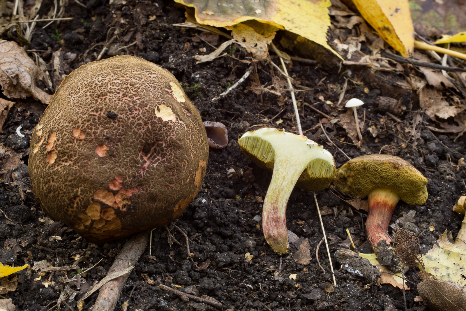 Zu dem steht in der Literatur, daß er im Alter rosabraun wird. Allerdings haben so wie ich meine alle Rotfüße zwischen Huthaut und Fleisch eine Rotfärbung, daher ist das auch nicht immer zwingend ein älterer cisalpinus, nur geschätzt. Der obere vor dem umgedrehten vermutlich auch cisalpinus, könnte auch chrysenteron sein, kaum zu sagen.