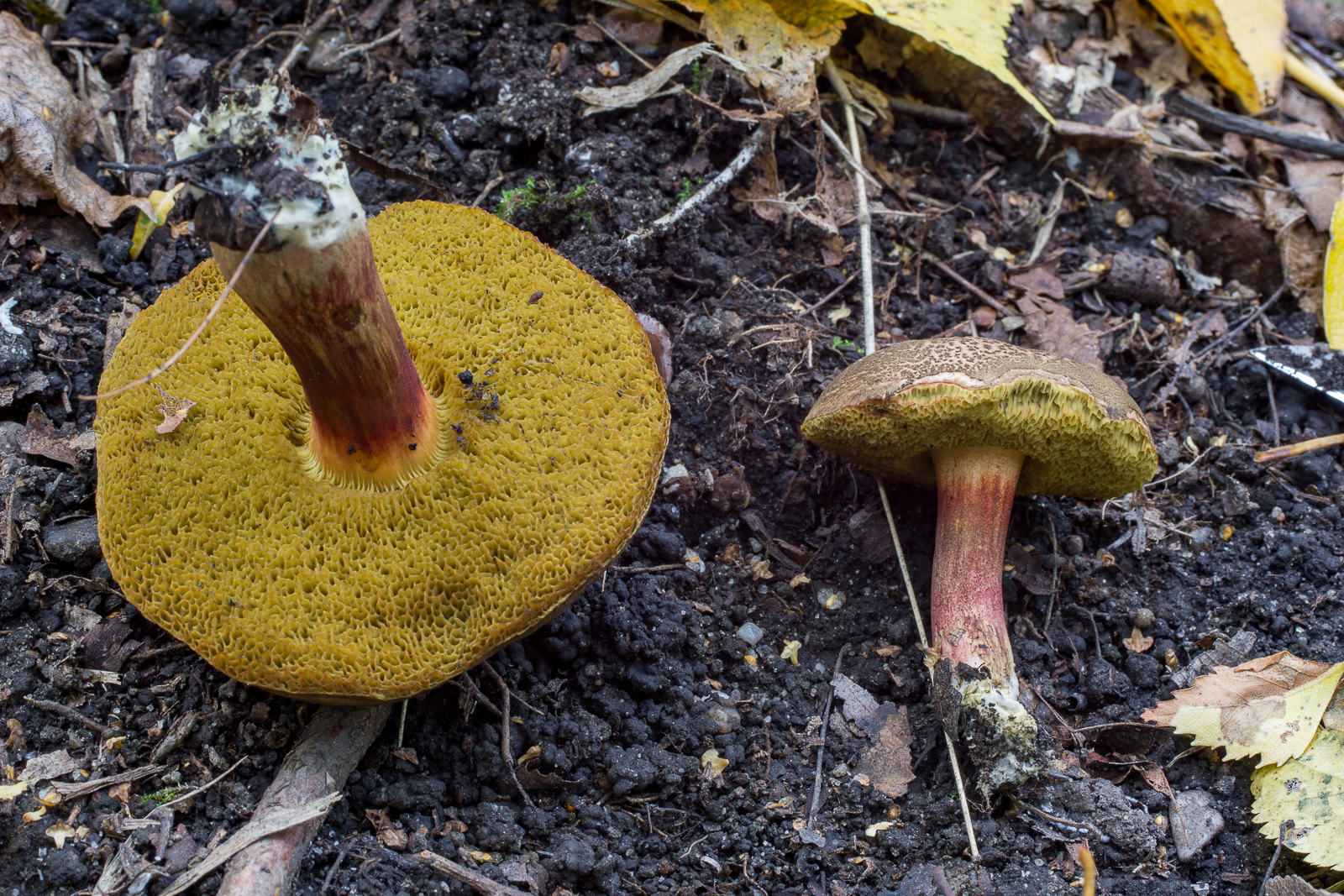 Hm, also Hortiboletus engelii ist bei mir ja ein Massenpilz, den würde ich eigentlich für die 2 ausschließen. Da hatte auch keiner karottenrote Punkte in der Basis und irgendwie schreit der Habitus Rotfuß, auch wenn ich das gar nicht wirklich begründen kann.