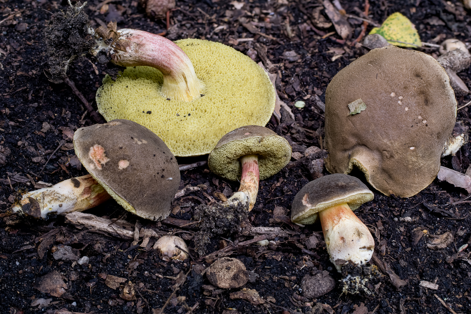 bei den blöden Teilen halte ich mich eigentlich lieber heraus aber jetzt bin ich frech und sage. Das ist alles der Gemeine Rotfuß (Xerocomellus chrysenteron). Damit liege ich bestimmt wieder falsch.