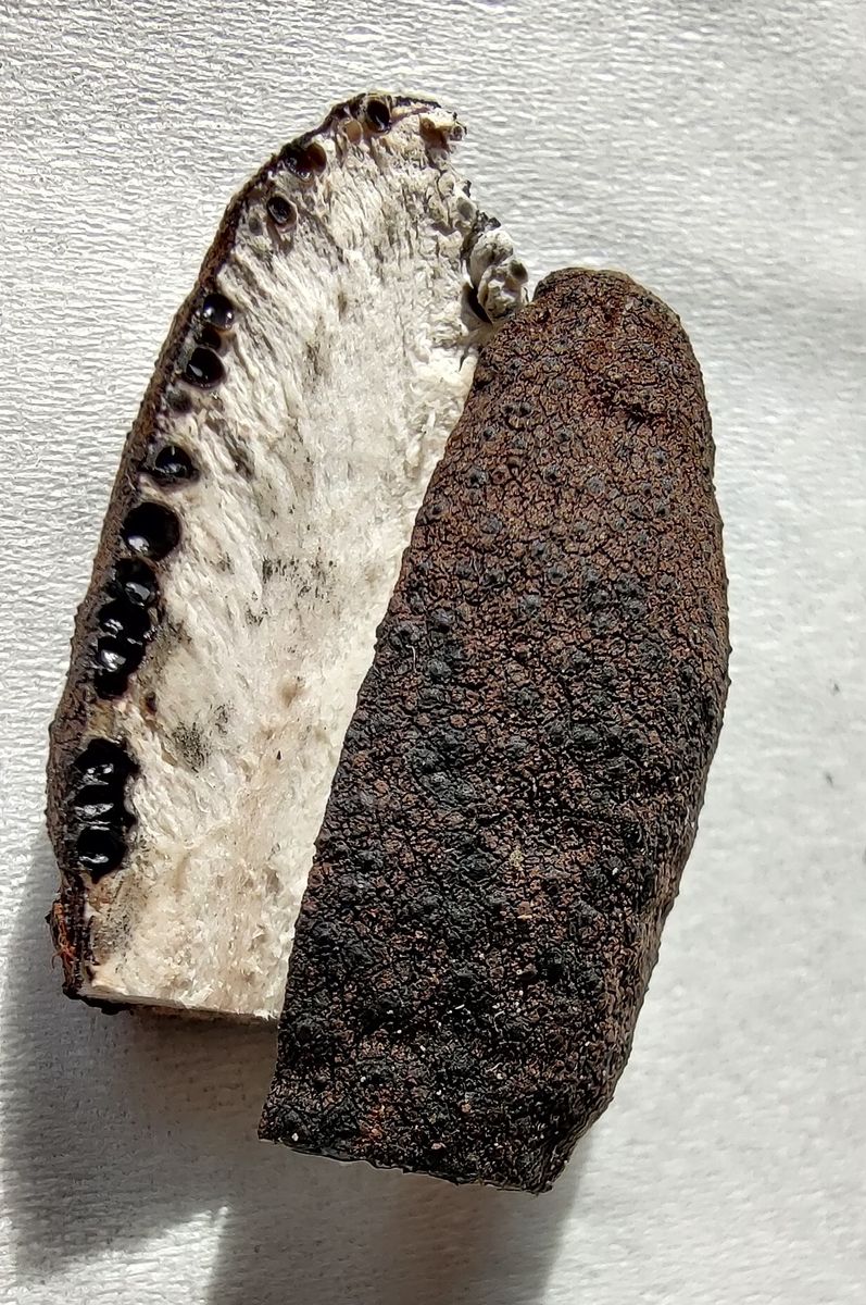 Also: Fund auf moosigem Baumstumpf in gemischtem Buchen/Fichtenwald. Viele kleine schwarze, recht harte und knubbelige Fruchtkörper die aussehen wie kleine Hinkelsteine. Milder Geruch, angenehm pilzig. Größe fingernagelgroß bis ca 5-7cm.