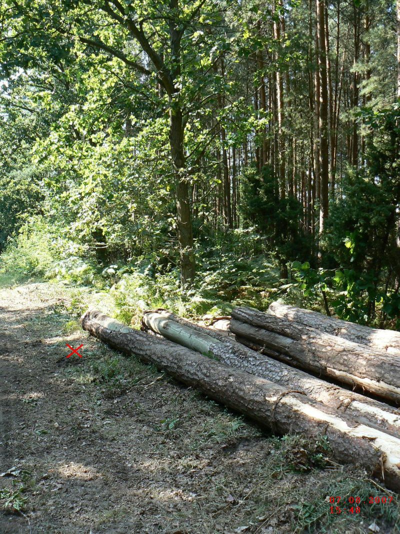 Unten siehst du ein Bild von der Hasenröhrlingsstelle. Ist schon ziemlich kaputtgefahren worden , die Stelle habe ich mit dem roten "X" gekennzeichnet, so in etwa stand er da. Früher war da mehr Sand und wenig Gras, die Forst wird demnächst wohl weitere Kiefern aus dem Wald holen, denn die Forstleute arbeiteten heute immer noch da. Jedenfalls wird wohl diese Stelle demnächst erloschen sein, wenn die weiter so mit den Baggern über die Fundstelle darüberfahren ;(
