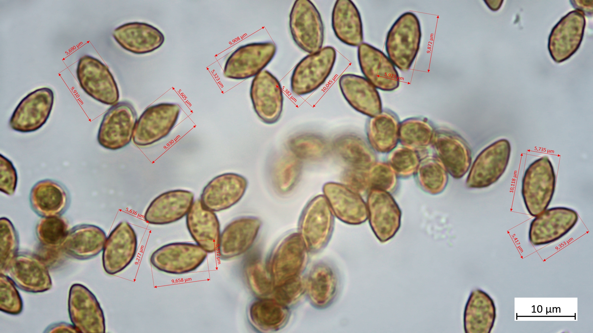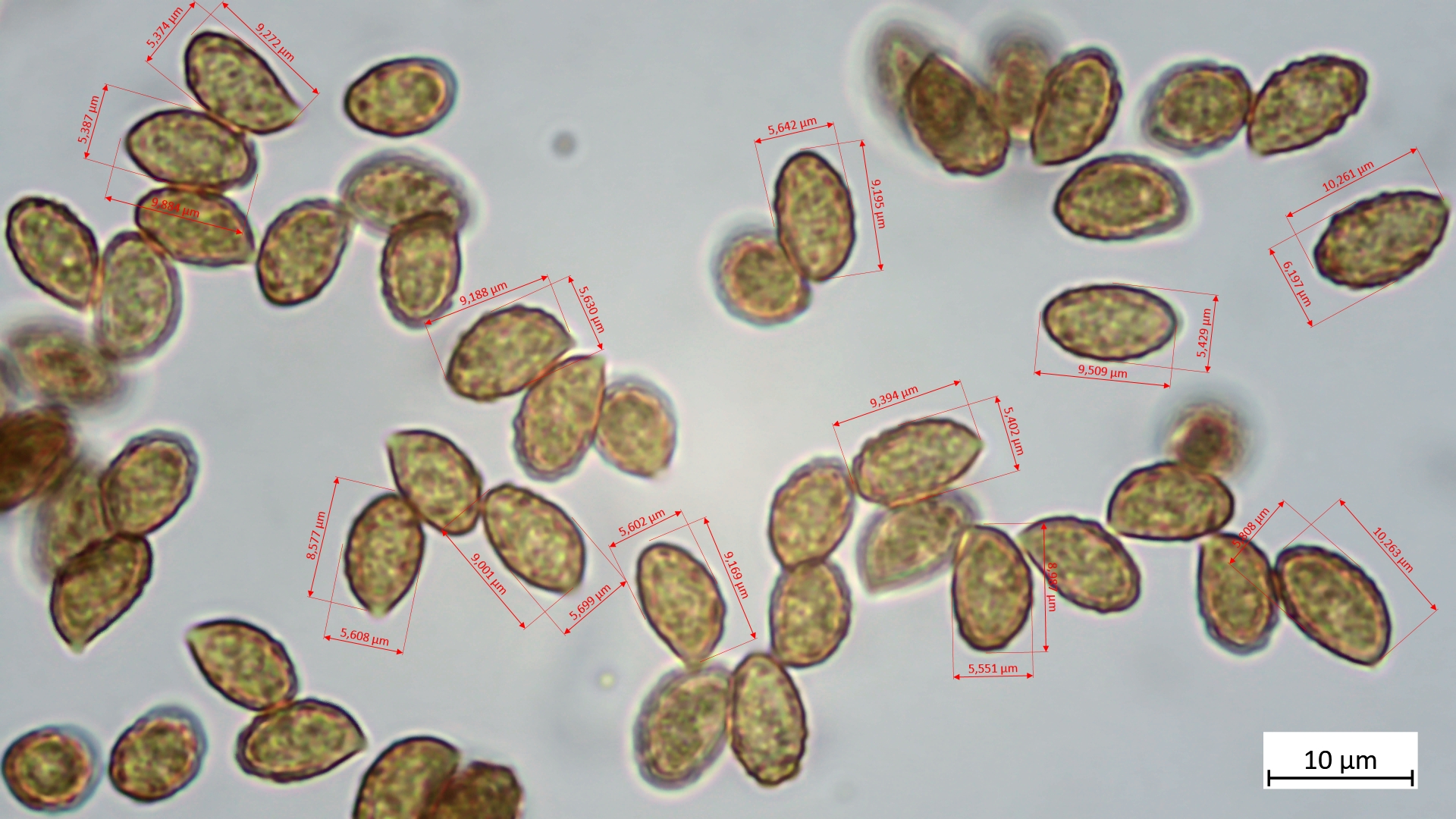 Sporen: 8,6-10,3 µm (av. 9,4 µm, SD 0,5 µm) x 5,4-6,2 µm (av. 5,6 µm, SD 0,2 µm); Q = 1,5-1,8 (av. 1,7, SD 0,1)(n = 12)