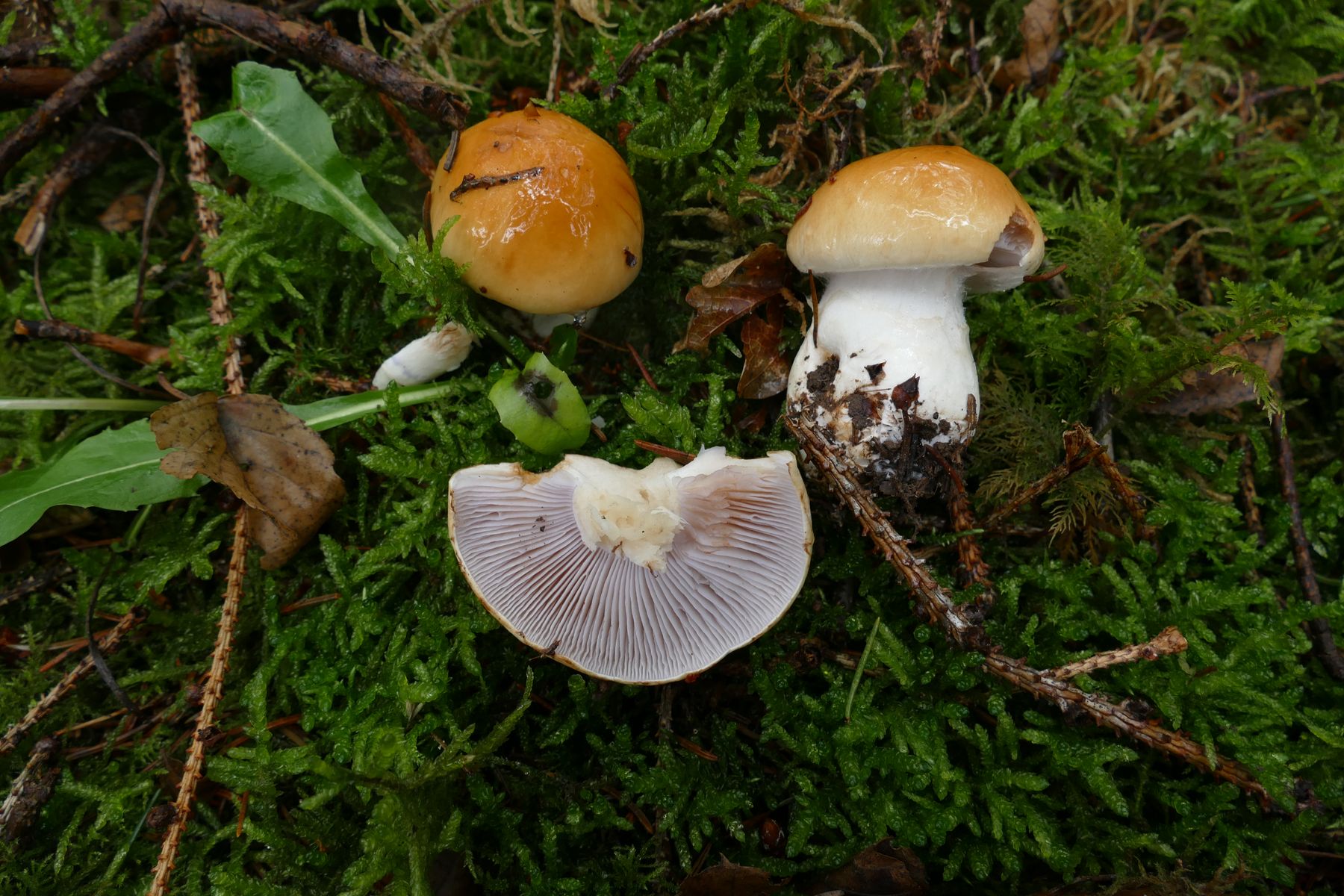 04 Cortinarius spec bei Eiche, Kiefer und sonst noch kleinere Laubgehölze (dachte wegen der lila Farben, den eher bräunlichen Hüten und der gelb-braunen KOH-Reaktionen an etwas aus dem Kreis variicolor, aber für selbigen sind die Sporen zu klein, auch wirkt er etwas zu schlankstielig und zu hell auf dem Hut, jedoch finde ich auch sonst nichts passendes, meine Bestimmungsschlüssel kommen da scheinbar an Grenzen). Leider jetzt am dritten Tag (Zeitmangel) auch alles andere als frisch, musste jetzt schnell weg.