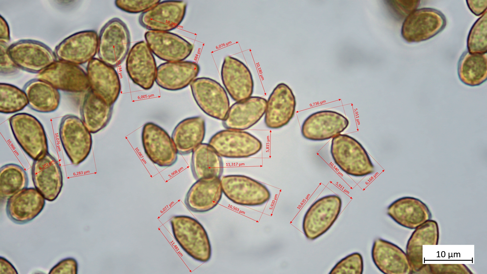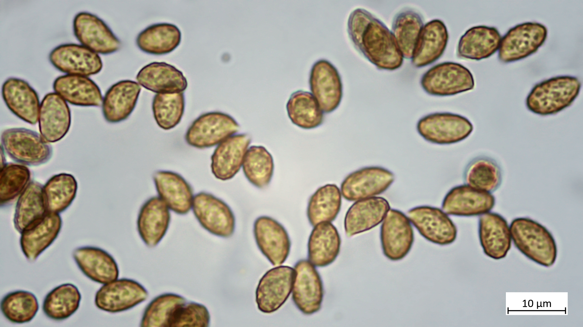 Sporen: 9,7-11,5 µm (av. 10,5 µm, SD 0,5 µm) x 5,8-6,3 µm (av. 6,0 µm, SD 0,1 µm); Q = 1,6-1,9 (av. 1,7, SD 0,1)(n = 12)