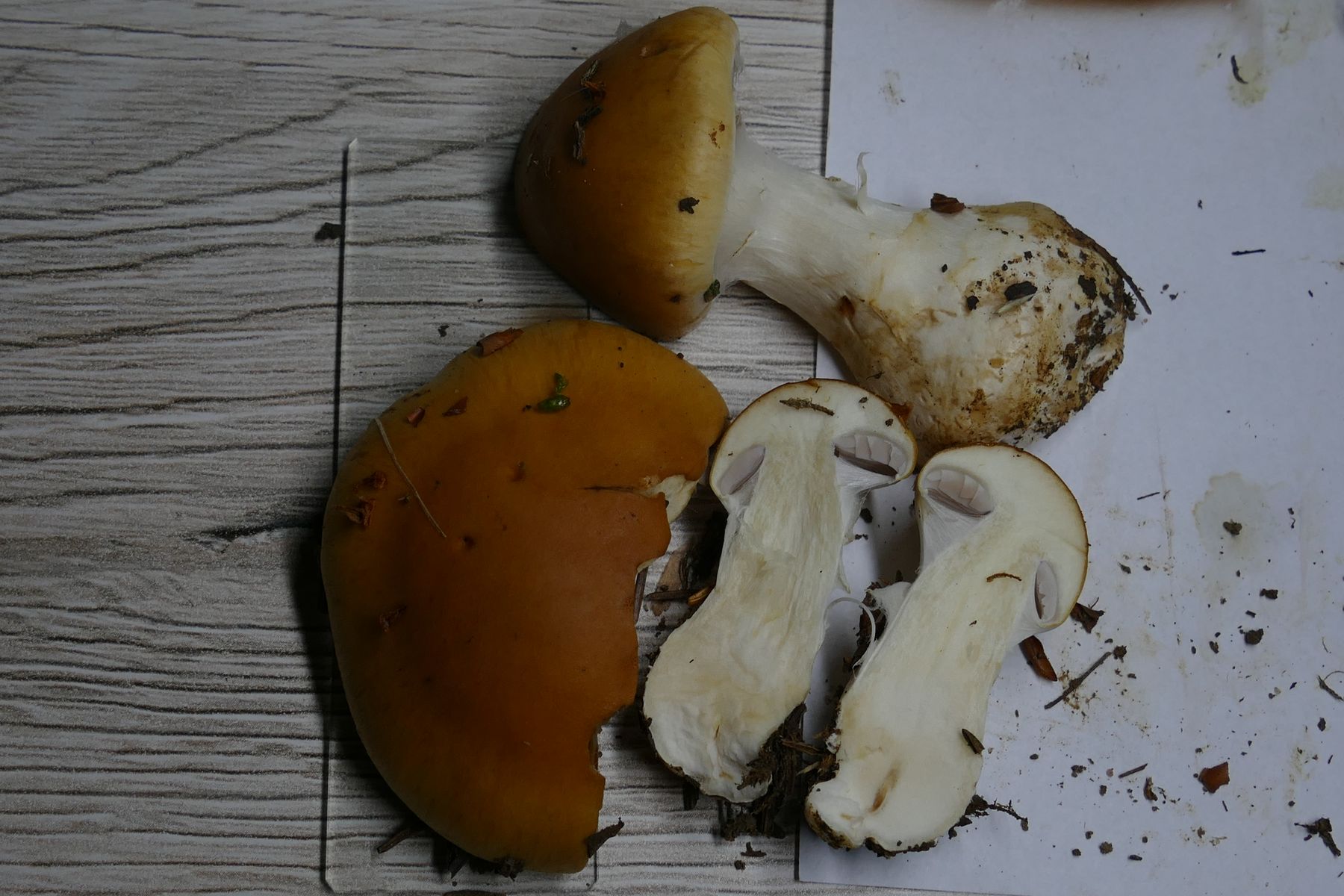 typisch Wuchsform und konzentrische Schuppen auf dem Hut. Alles noch im Anfangsstadium. Fleisch weiß und kräftiger Geruch, für mich immer wieder schwer zu beschreiben süßlich, kakaoartig aber irgendwie auch unangenehm. Lamellen hell.