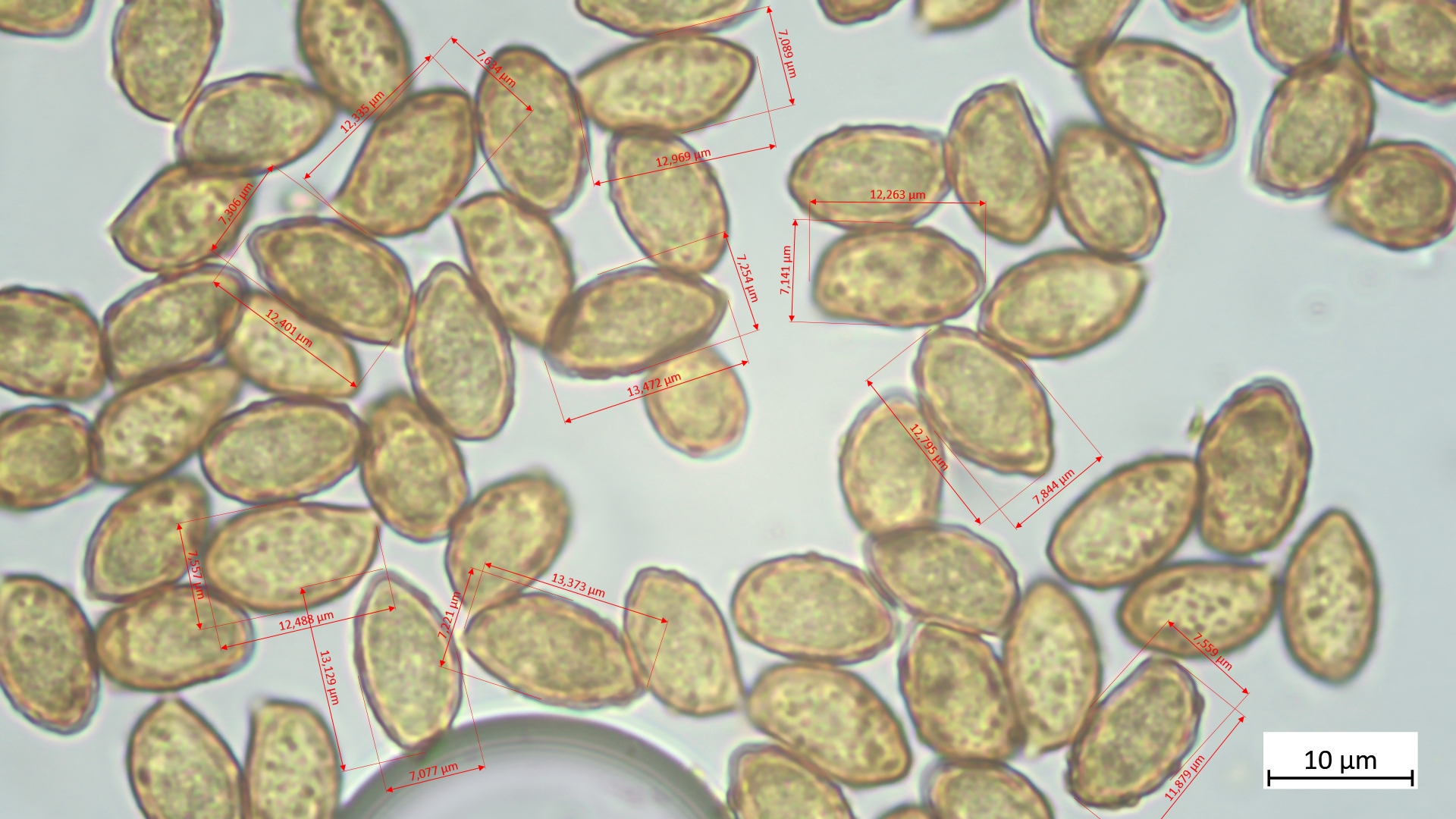 Sporen: 8,6-10,3 µm (av. 9,4 µm, SD 0,5 µm) x 5,4-6,2 µm (av. 5,6 µm, SD 0,2 µm); Q = 1,5-1,8 (av. 1,7, SD 0,1)(n = 12)