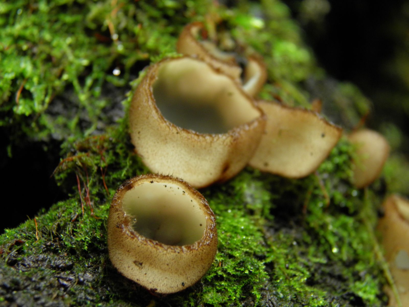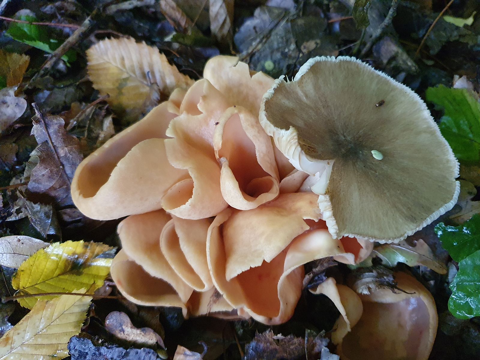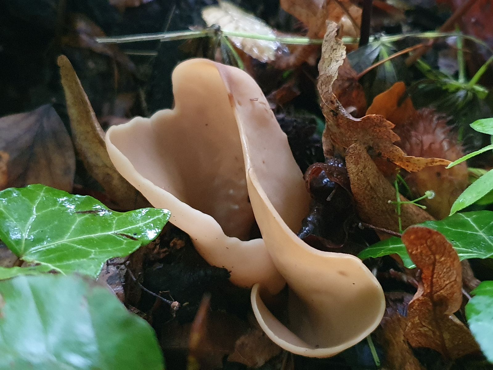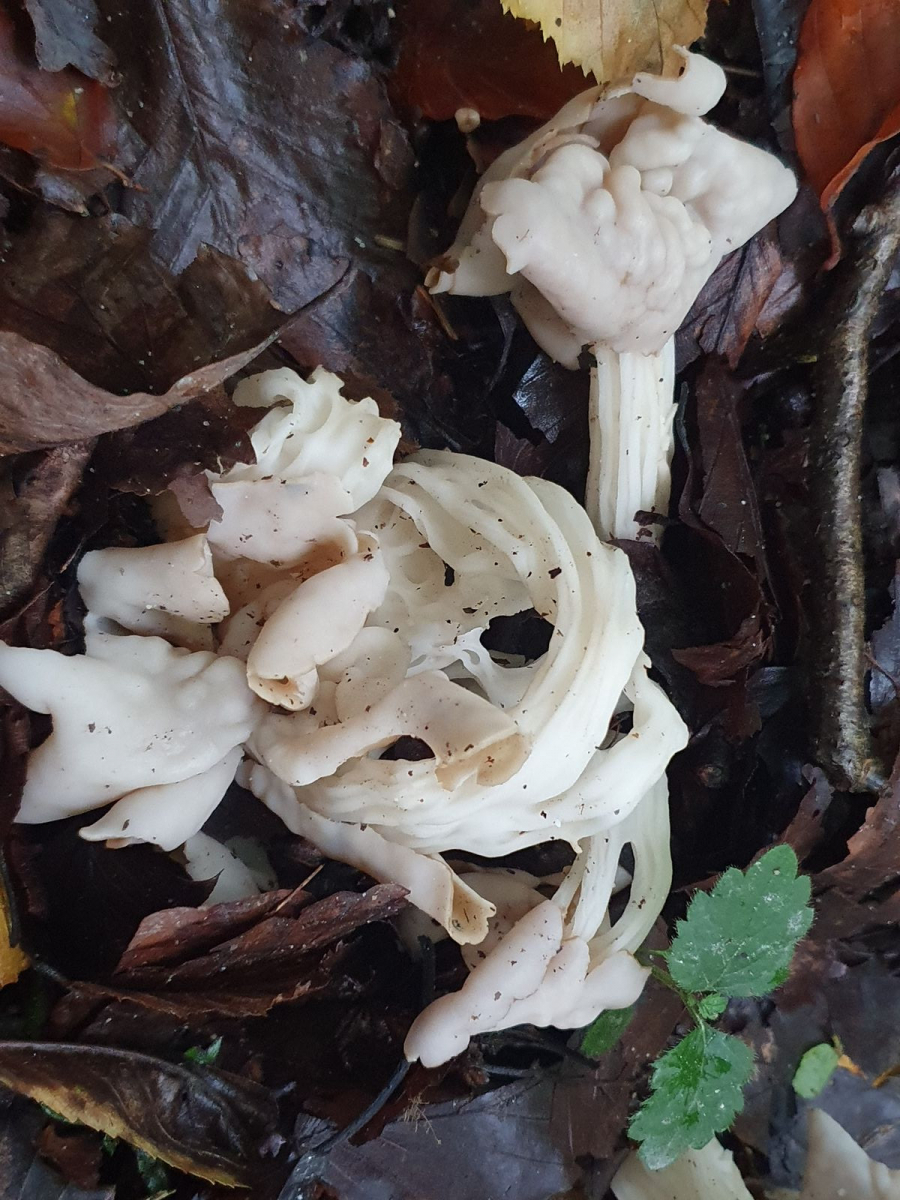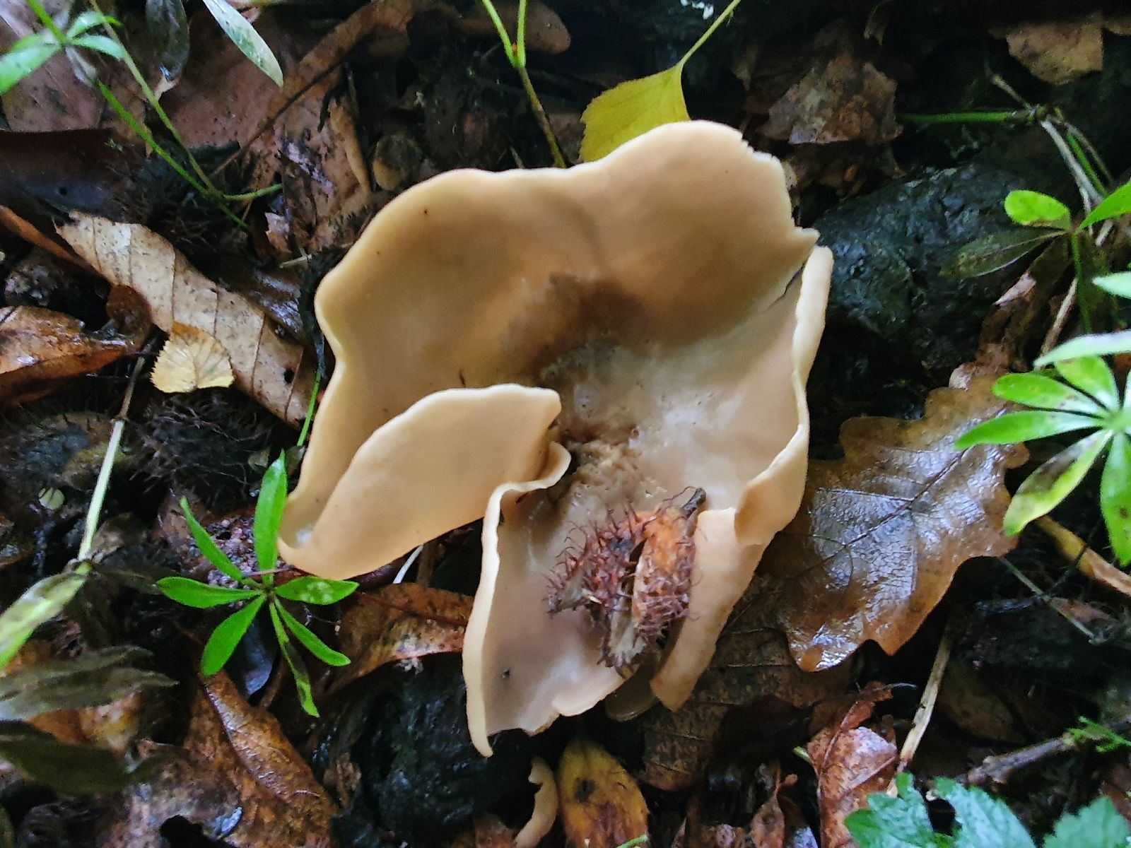 11 relativ große, blasse Becherlinge, knapp unter 10cm, vlt Buchenwaldbecherlinge