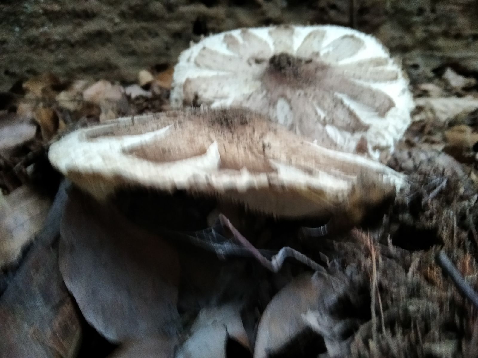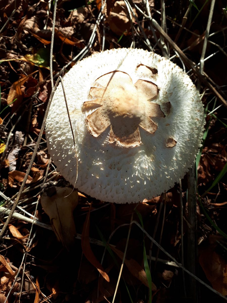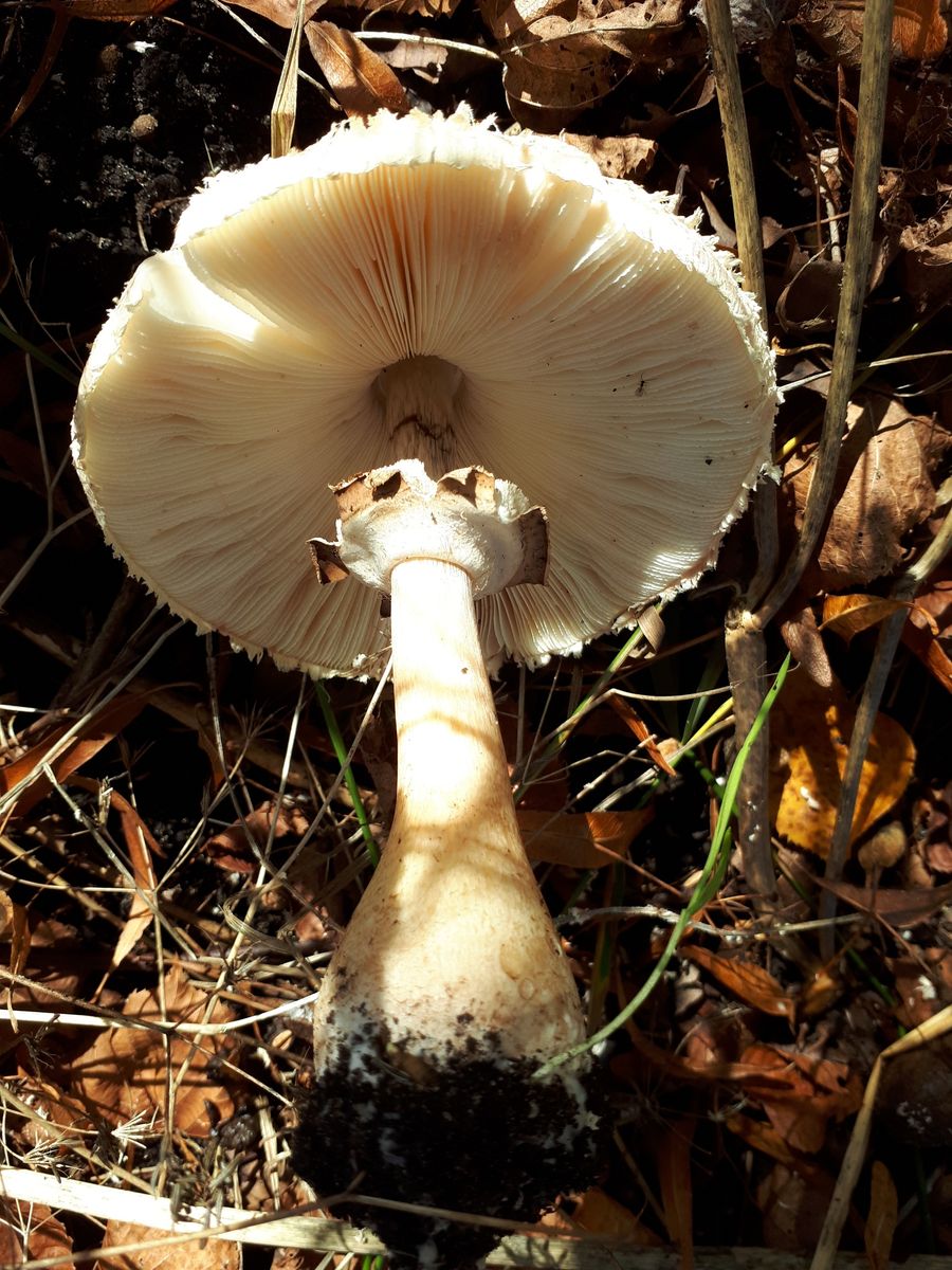 Die Pilze sahen in der Sonne aber so schön aus, dass ich mit spitzen Füßen hinschlich und ein paar Fotos machte. Mitnehmen konnte ich keinen, weil ich an Krücken gehe und auch kein Behältnis dabei hatte. Aber nun komme ich mit meinen Büchern so gar nicht weiter, trotz der markanten Optik. Die Hüte waren so um die 10 cm groß. Einen Geruch konnte ich nicht feststellen. Riesige Champignons? Kleine Parasole? Oder ganz was anderes? Auffällig finde ich die gelben Ringe am Stiel. Hat jemand eine Idee?