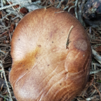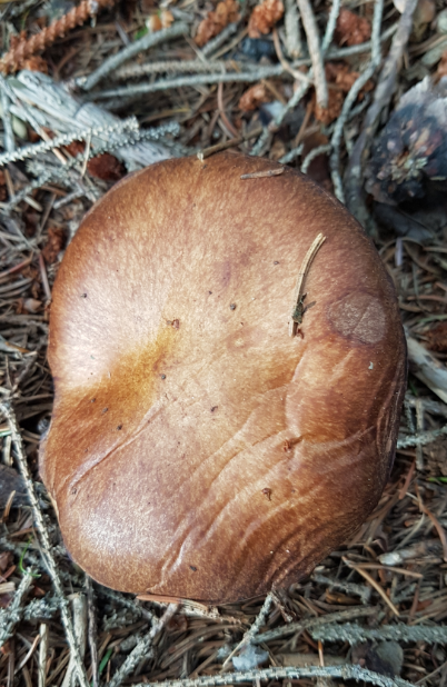 Folgenden Fund habe ich zwischen Fichten gemacht. Anfangs war ich völlig ratlos, doch nach Studium meiner Bilder habe ich Früchte von einer Lärche gefunden. Daher bin ich auf den Grauen Lärchenröhrling gekommen. Den habe ich schon öfter gefunden, allerdings noch nie derart braun an Hut und Röhren.