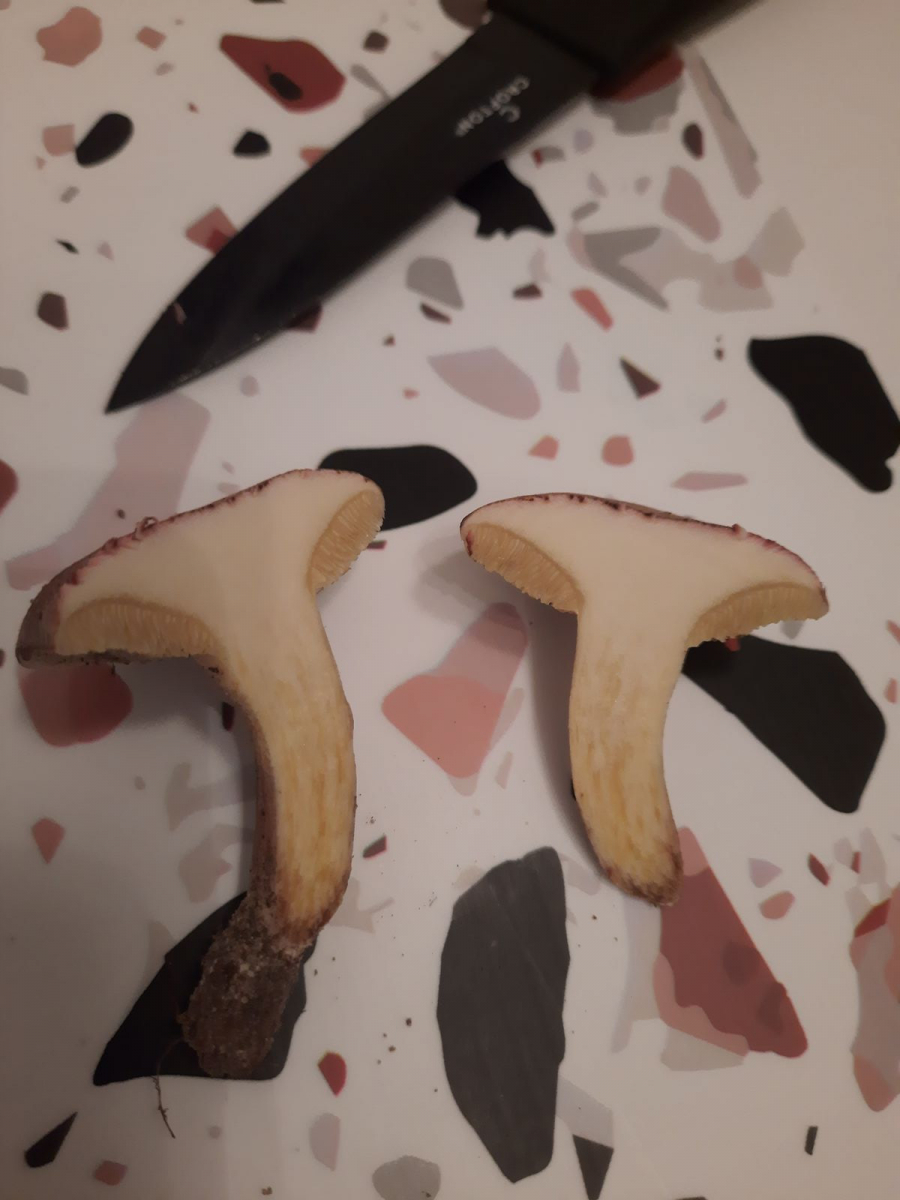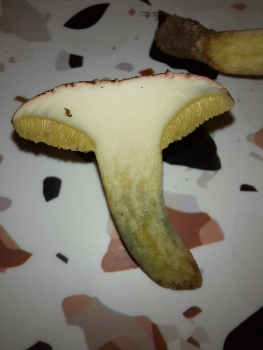 Bei dem falschen Rotfußröhrling steht auf 123pilzsuche zum Fleisch: "bei Verletzung blau färbend, schnell wieder weißlich werdend". Den letzten Teil kann ich nicht bestätigen, ist immer noch blau verfärbt