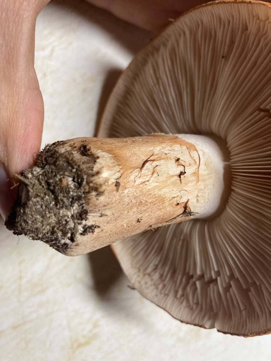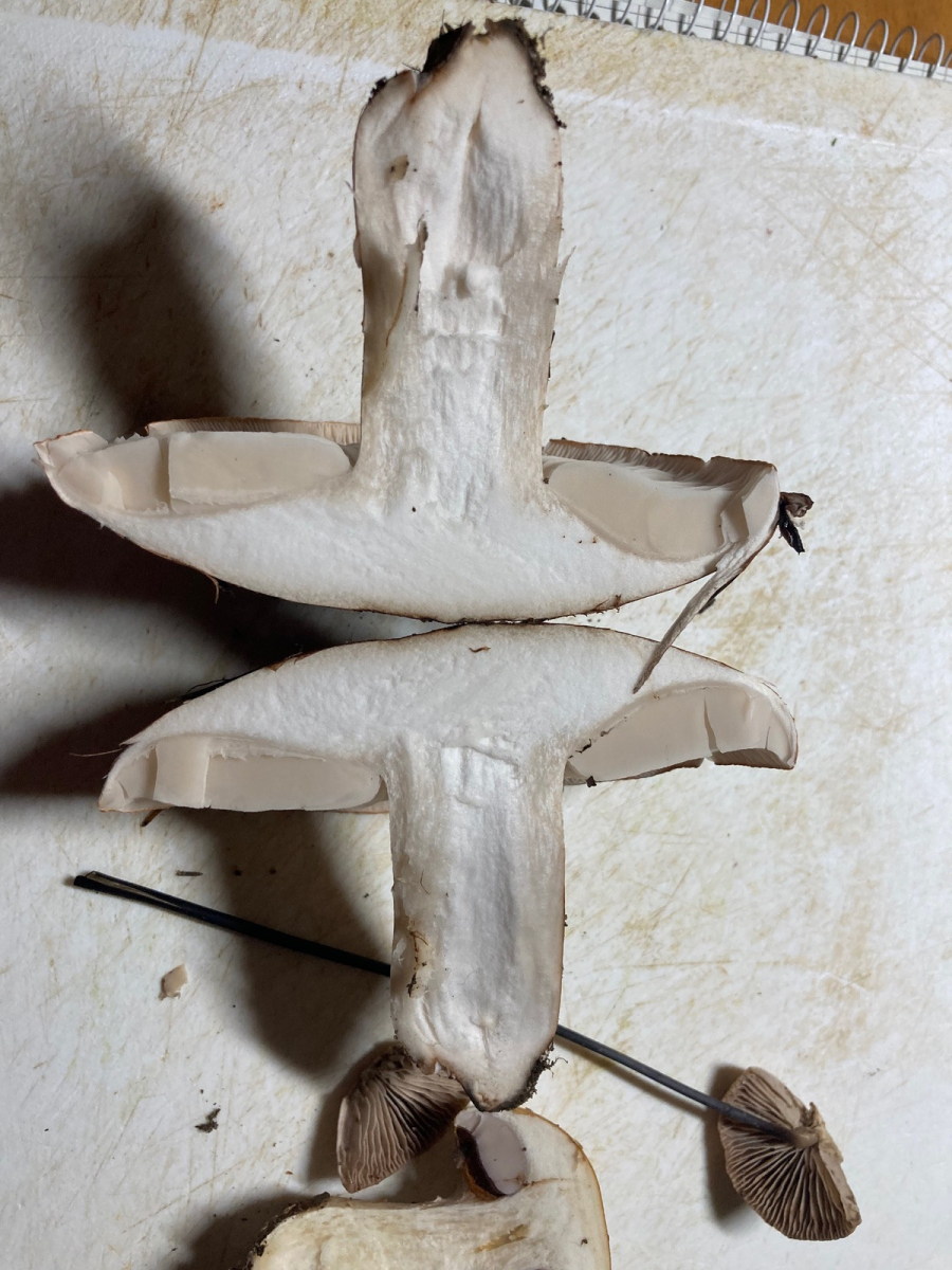Stiel: 5.5 cm hoch, 2.5 cm dick, faserig. Kein Ring, weiß am Ansatz, bräunlich zur Basis.