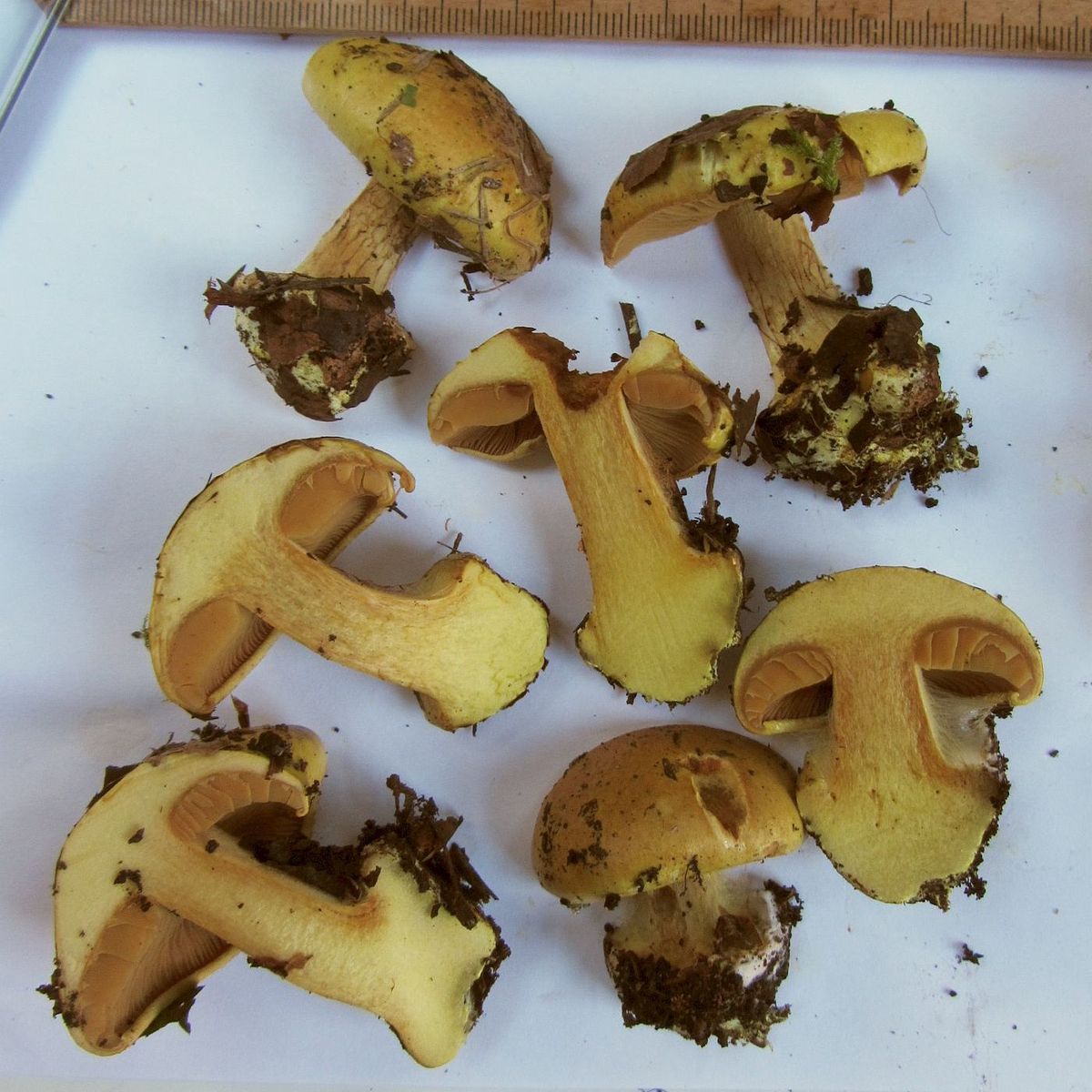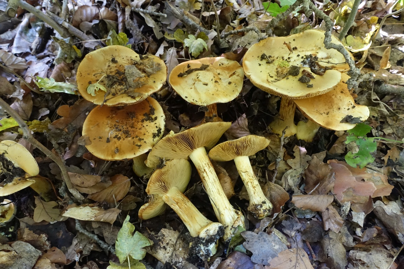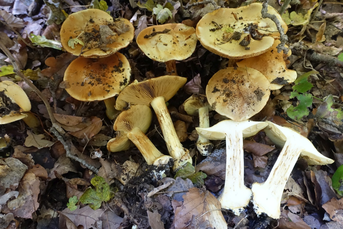 heute fand ich auf Kalk eine schöne Kollektion einer Phlegmatie aus der Sektion Fulvi. Der gesamte Pilz ist kräftig gelb gelb-ockerlich mit leicht grünlichem Einschlag. Der Hut scheint im Alter vor allem im Zentrum dunkler zu werden, bei einigen Fruchtkörpern gibt es mitunter dunkle schorfartige Flocken auf dem Hut. Obwohl ich kein ganz junges Exemplar finden konnte, kann man den Lamellen ansehen, dass sie jung gelblich, vielleicht sogar leicht grünlich waren. Die Knolle ist ausgeprägt und gerandet; die Knollenhaut scheint im Alter zu bräunen. Das Fleisch ist im gesamten Fruchtkörper hellgelb mit ganz leicht grünlichem Einschlag weißlich bis ganz leicht gelblich, in der Knolle etwas gesättigter gelblich mit grünlicher Note. Geschmack nicht getestet mild ohne besonderes Merkmal, Geruch ist mehr oder weniger unauffällig. KOH auf dem Hut reagiert mäßig bräunlich (also negativ) am Knollenrand kräftig braun; im Hut- und Stielfleisch nur ganz blass, im Knollenfleisch rosalich (siehe letztes Bild). Sporen leider mangels Zeit noch nicht vermessen, wird aber nachgeholt (siehe unten!) . Am Fundort vor allem (Hain)Buchen und Eichen auf Kalk; die Fruchtkörper standen dicht gedrängt (siehe Bilder).