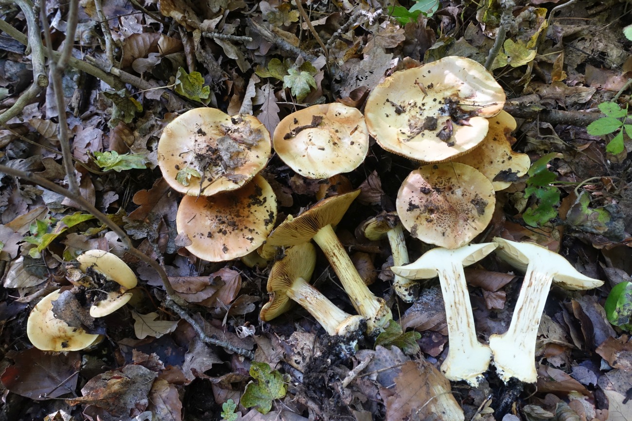 heute fand ich auf Kalk eine schöne Kollektion einer Phlegmatie aus der Sektion Fulvi. Der gesamte Pilz ist kräftig gelb gelb-ockerlich mit leicht grünlichem Einschlag. Der Hut scheint im Alter vor allem im Zentrum dunkler zu werden, bei einigen Fruchtkörpern gibt es mitunter dunkle schorfartige Flocken auf dem Hut. Obwohl ich kein ganz junges Exemplar finden konnte, kann man den Lamellen ansehen, dass sie jung gelblich, vielleicht sogar leicht grünlich waren. Die Knolle ist ausgeprägt und gerandet; die Knollenhaut scheint im Alter zu bräunen. Das Fleisch ist im gesamten Fruchtkörper hellgelb mit ganz leicht grünlichem Einschlag weißlich bis ganz leicht gelblich, in der Knolle etwas gesättigter gelblich mit grünlicher Note. Geschmack nicht getestet mild ohne besonderes Merkmal, Geruch ist mehr oder weniger unauffällig. KOH auf dem Hut reagiert mäßig bräunlich (also negativ) am Knollenrand kräftig braun; im Hut- und Stielfleisch nur ganz blass, im Knollenfleisch rosalich (siehe letztes Bild). Sporen leider mangels Zeit noch nicht vermessen, wird aber nachgeholt (siehe unten!) . Am Fundort vor allem (Hain)Buchen und Eichen auf Kalk; die Fruchtkörper standen dicht gedrängt (siehe Bilder).
