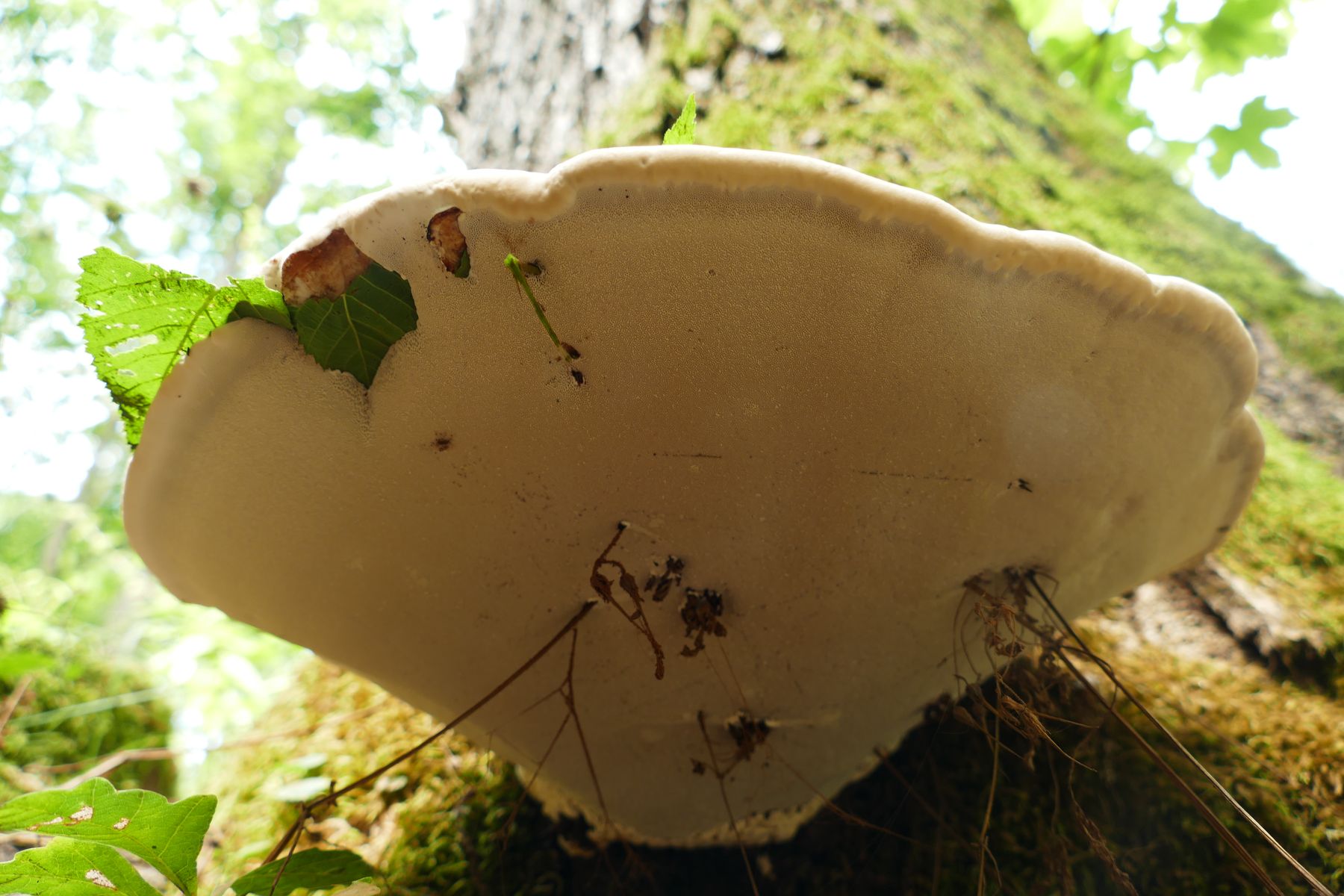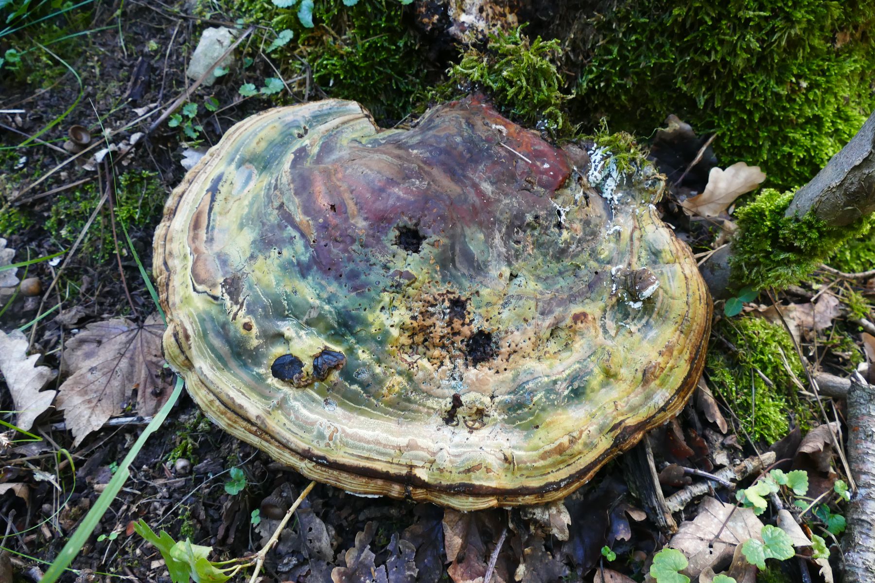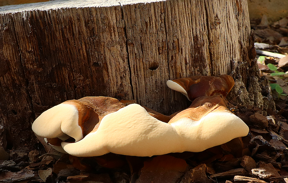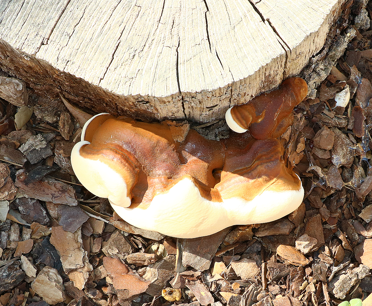 here a finding of G. resinaceum in July - broadly connected to the base of a living oak tree, showing three zones of colours: innermost (red-)brown, then orange-brown, outside creme.