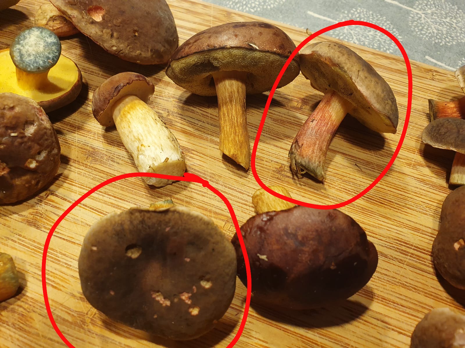 Ich stelle ein paar Bilder dazu. Im ersten Bild habe ich einen kleinen Steinpilz und zwei Maroni dazugelegt und die Farbe zu verdeutlichen. Die eingekreisten sind die Unbekannten. Auf allen anderen Fotos sind nur die Unbekannten.