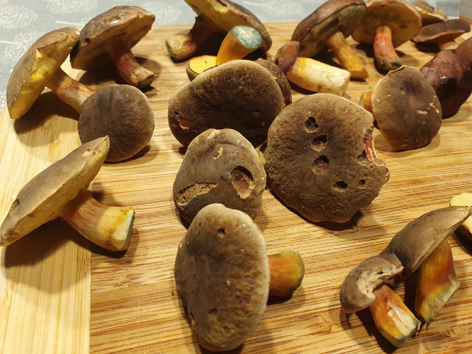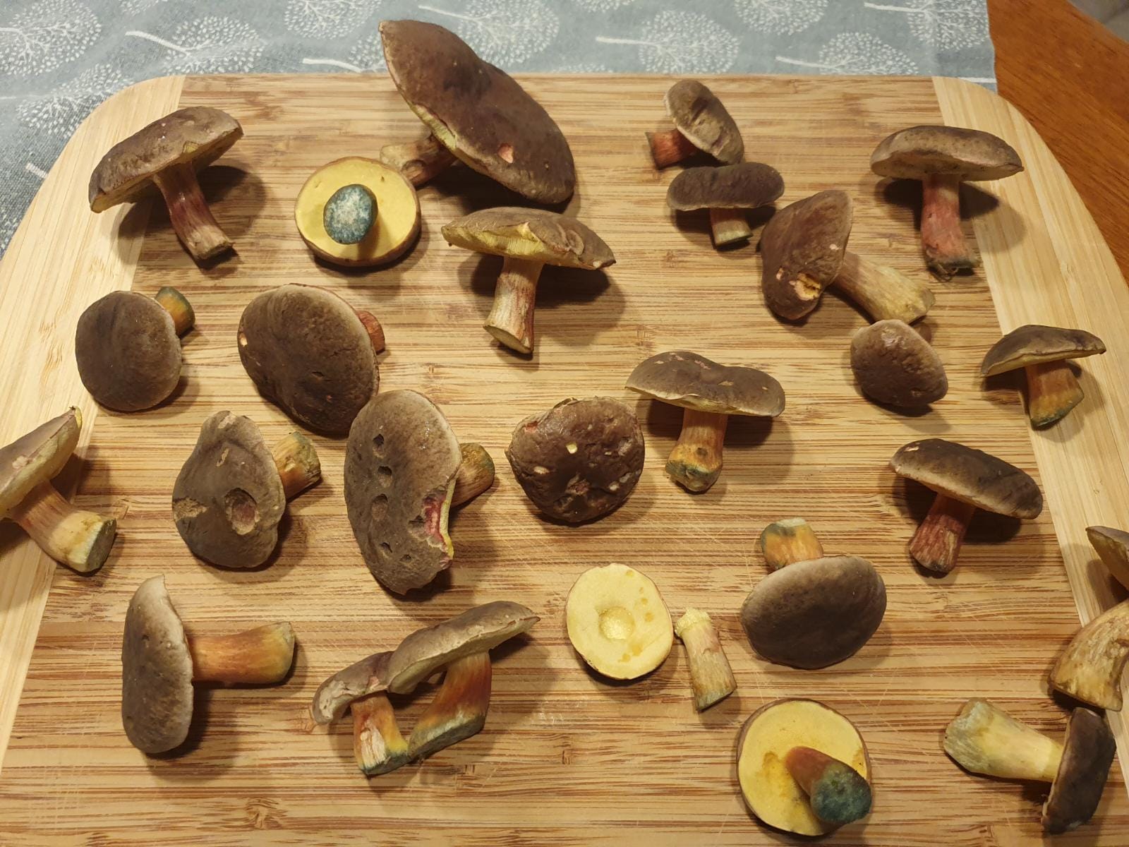 Haben eine kleine Runde gedreht und Maronen und Steinpilze gefunden. In einem Wald sind wir auf gesellige Gruppen von kleinen, mattbraunen Röhrlingen gestoßen. Hut ca. 3-7cm Durchmesser, Stiele gelb mit mal mehr mal weniger rotem "Schleier", Schwamm schon bei den Kleinen sehr leuchtend gelb. Nach dem abschneiden keine blaue Färbung, aber nach ca. 20min alle Anschnitte deutlich blau.