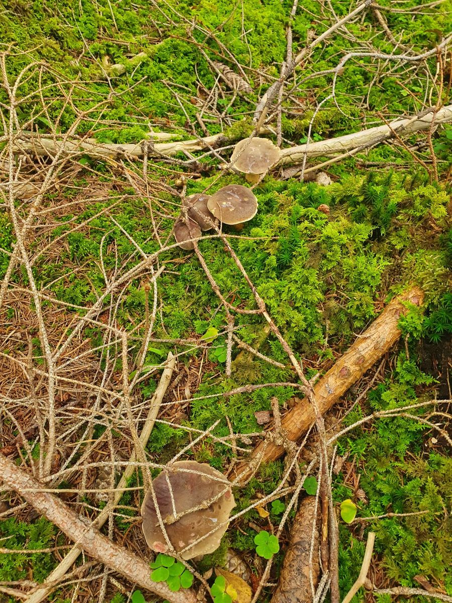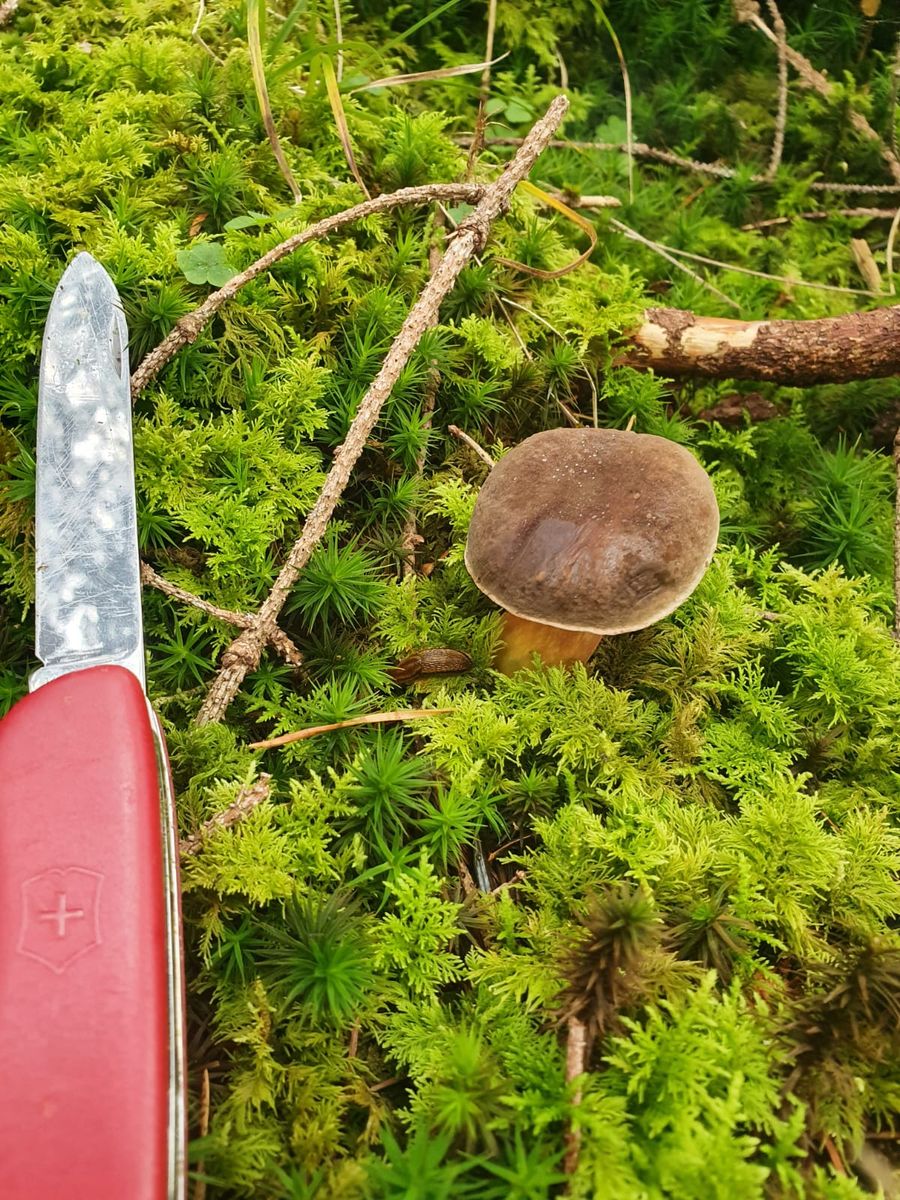 Die Maronen, die wir sonst so gefunden haben, haben deutlich rot-braunere Hüte, die Unbekannten haben eher so Fichtenrinden-braune Hüte, die aussehen wie mattes Leder, sehr schön eigentlich. Die Gruppen waren so 5-15 Exemplare rund um einzelne Bäume. Der Wald war ein lichter, alter Fichtenwald, der Boden bemoost.