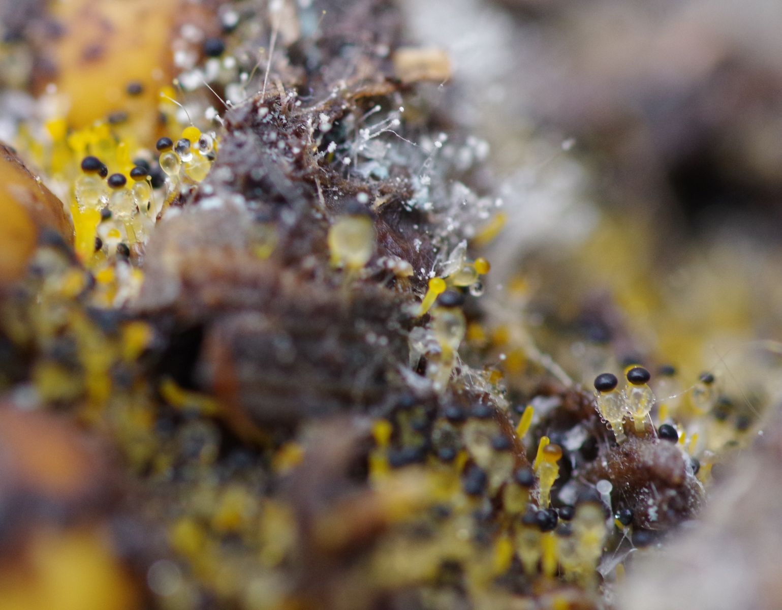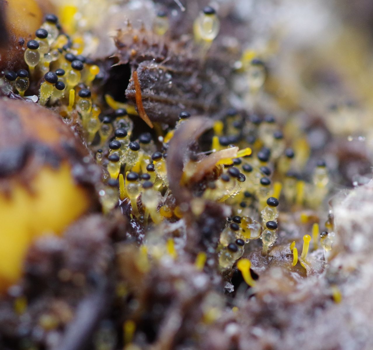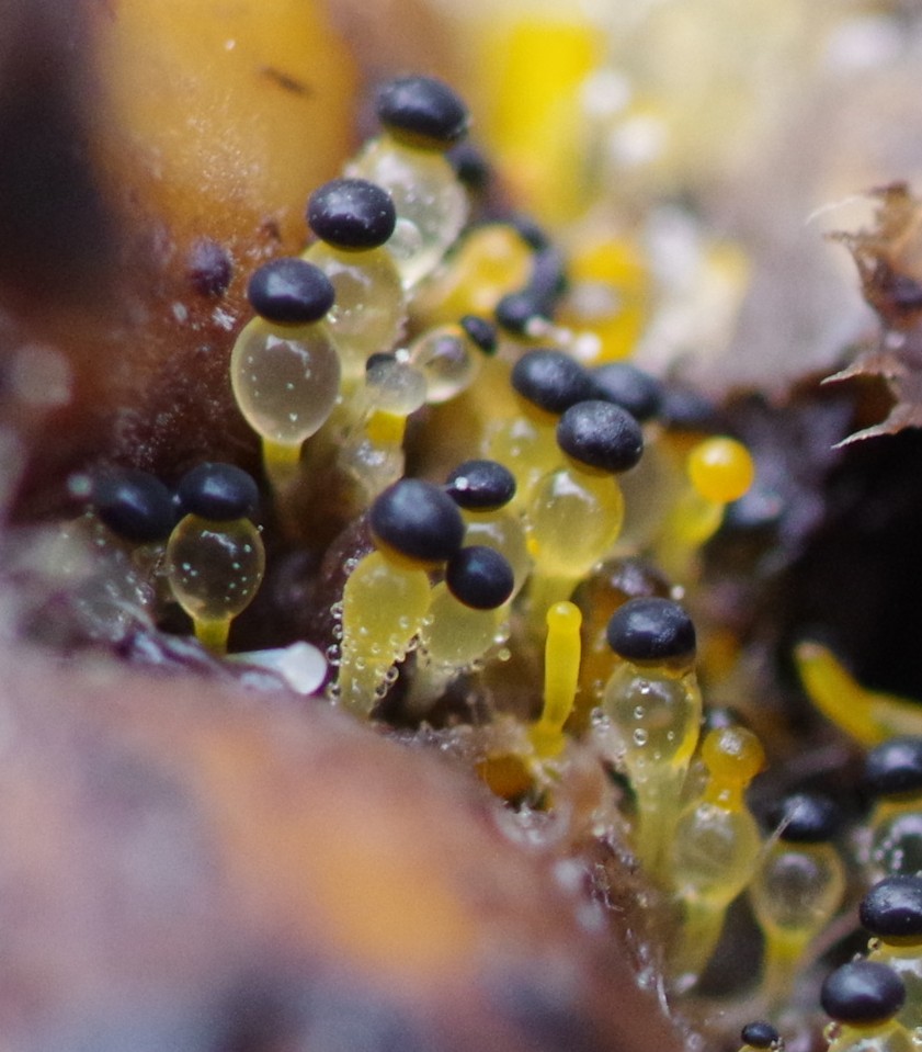 man sieht ziemlich schick die verschiedenen Entwicklungsstadien von orangen Nadeln über orange, gestielte Knuppel bis hin zu kristallklaren Pilzen mit zweifarbigen Deckeln