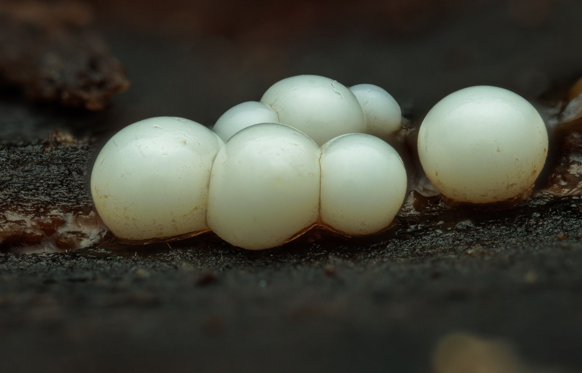 Diese weißen Schleimkugeln habe ich auf einem Stück Rinde gefunden. Teilweise in größeren Gruppen mit einer Größe von 1-2mm.