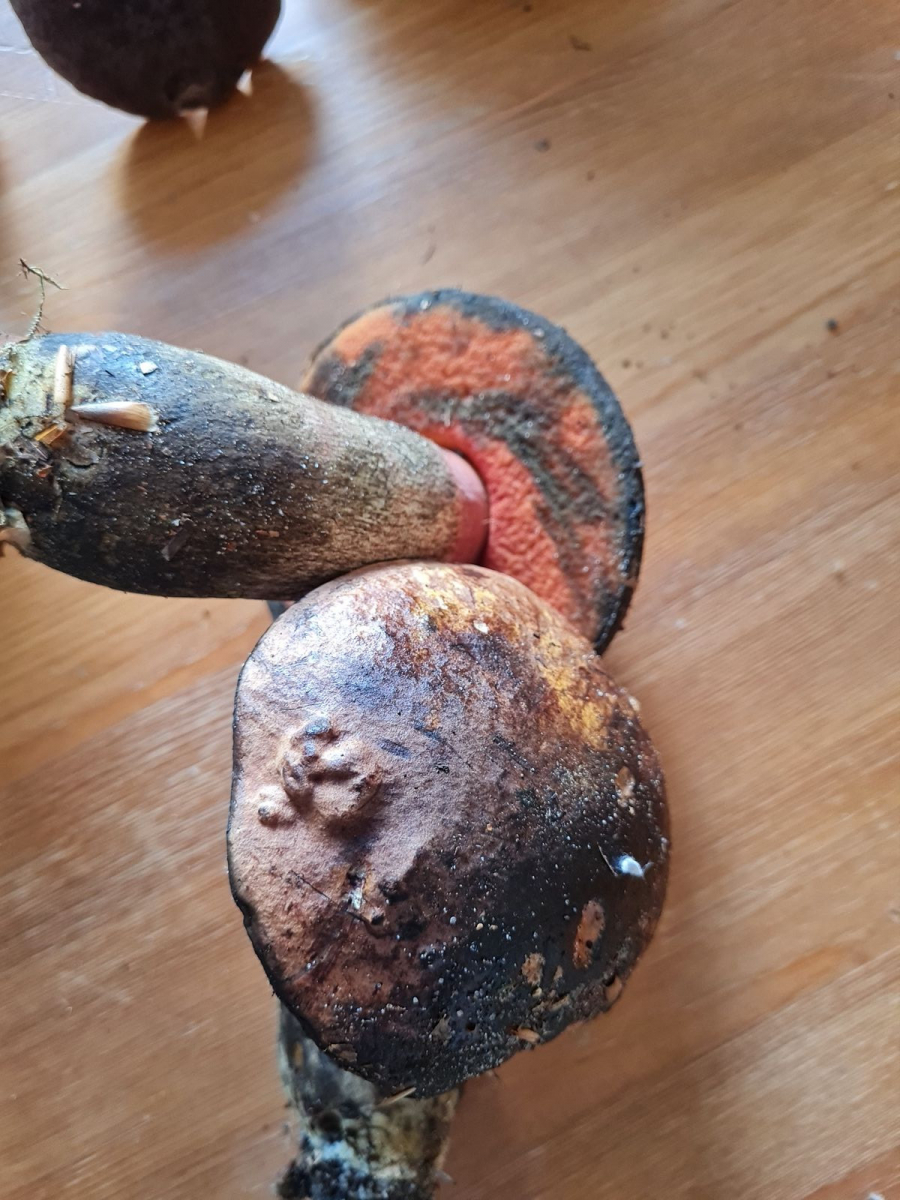 ja flocken Hexe (Neoboletus erythropus) und unten Rotfußröhrling (Xerocomellus chrysenteron) mit Goldschimmel. Goldschimmel ist giftig.