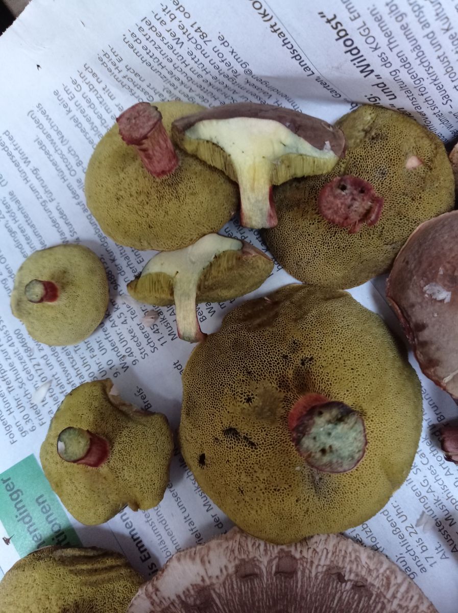 heute im Mischwald diese kleinen Rotfußröhrlinge gesehen. Ich dachte erst das wären Butterpilze, die stehen auch da. Aber schleimig ist da nix. Also beim Schnitt hätte ich fast geschrieben bläut nicht. Bläut wohl seehr langsam. Erst beim Auspacken des Korb zuhause war es etwas gebläut. Reingebissen hab ich nicht, aber riecht neutral.