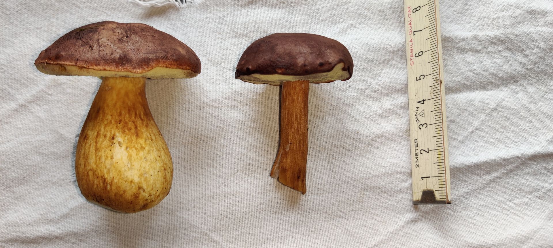 Einmal mit dickem Stiel und sehr festem Hut. Fleisch im Schnitt eher gelblich. Daneben Maronen mit viel schmaleren Stiel (selbst große Exemplare), mit Fleisch im Schnitt eher beige-weiss und mit viel weicherem Hut.