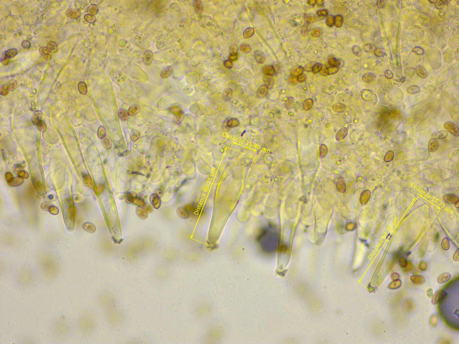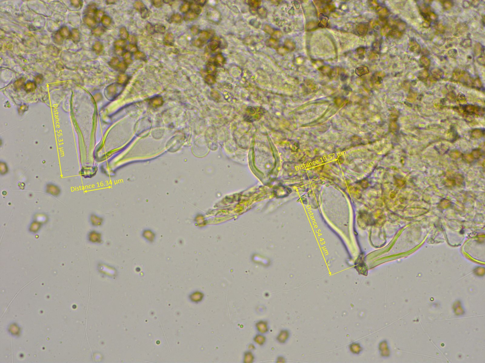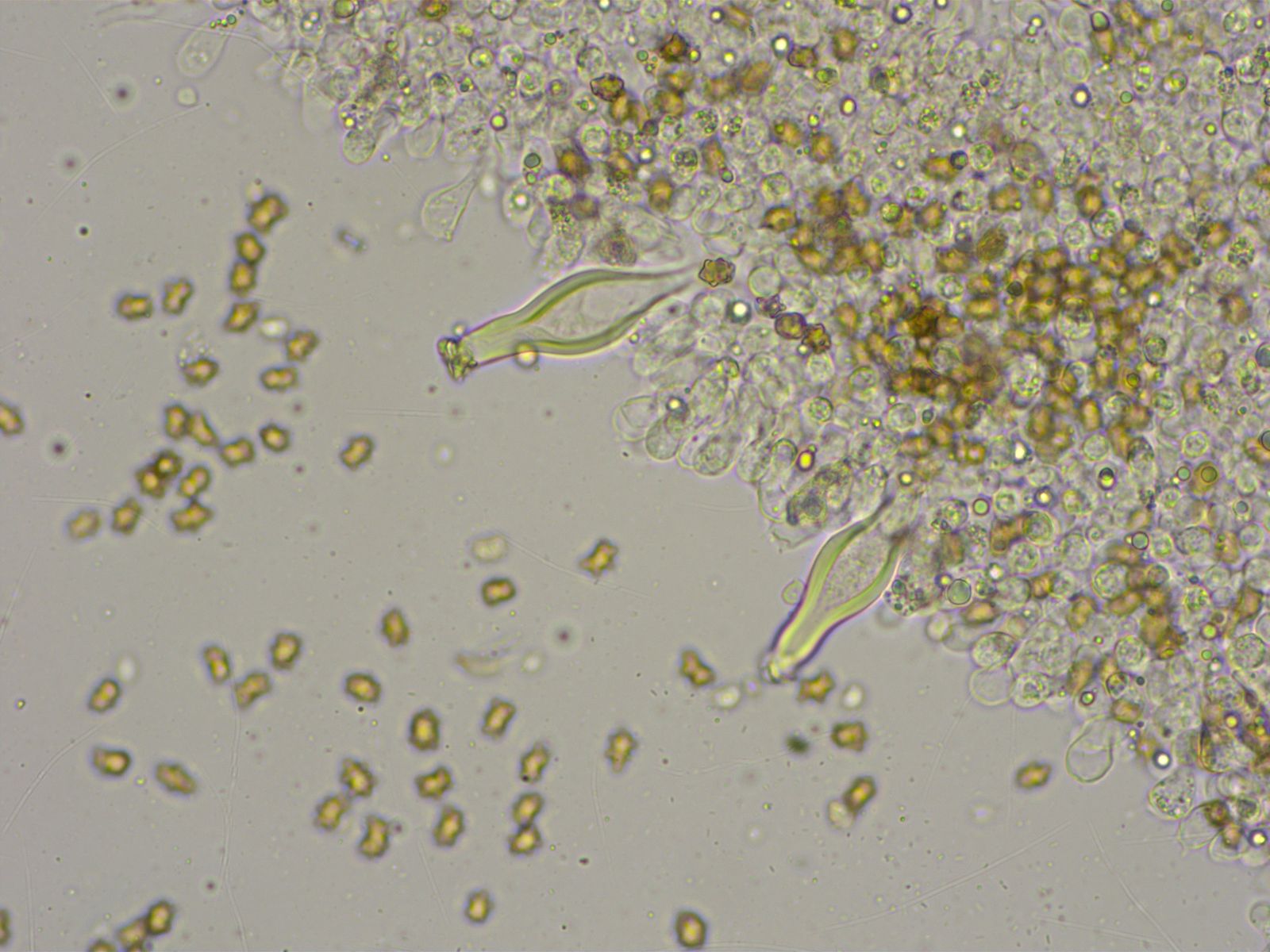 Dickwandige Kaulozystiden gab es nur sehr wenige an der Stielspitze, dafür aber viele keulig verdickte Elemente.