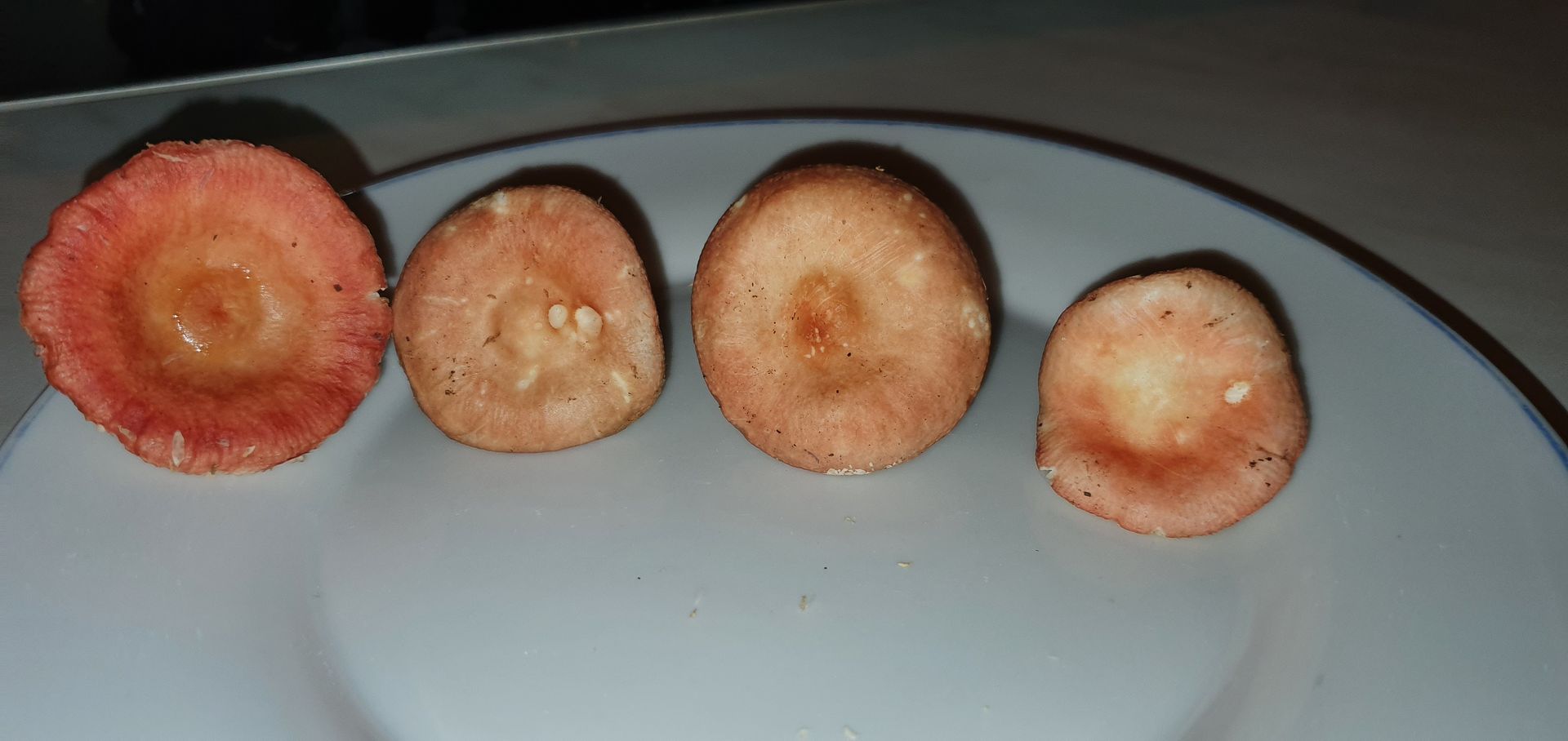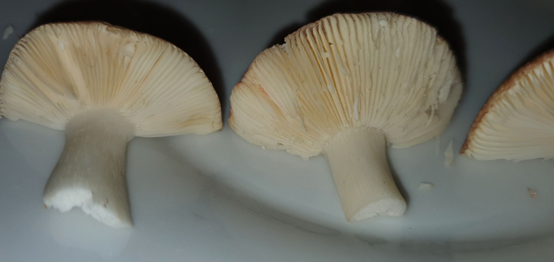 Geschmacksprobe mild. Insgesamt sehr filigran und sehr zerbrechlich, nicht allzu hartes Fleisch, Lamellen erst weich wirkend, dann dennoch stark splitternd. Stiel weißlich, sehr empfindlich/zerbrechlich, innen wattig hohl, auch bei den ganz kleinen schon. Standen nur an einer Stelle, aber recht viele, geschätzt etwa 30 Fruchtkörper, die meisten auch in jungem Zustand madig und hinüber, die 4 auf den Fotos waren noch in Ordnung.