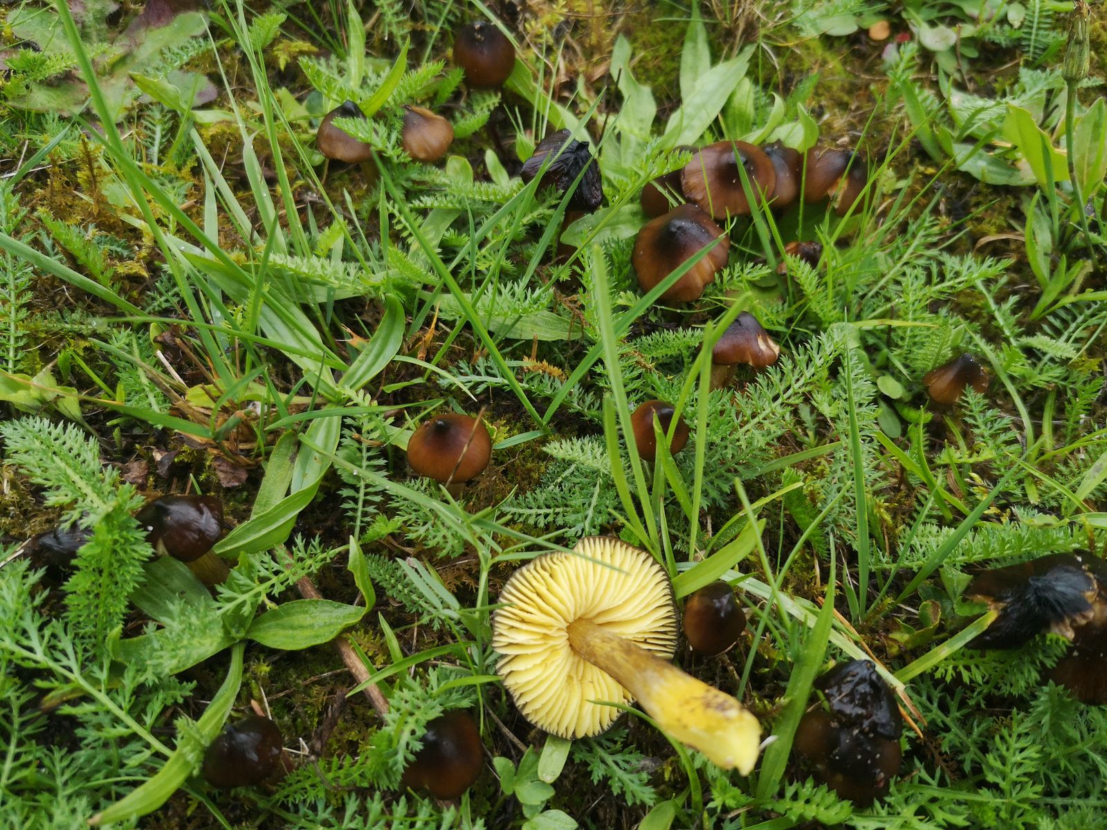 15. Ein Saftling - der braungelbe Saftling Hygrocybe spadicea? Edit: eher schwärzender Saftling (danke Jörg) - nicht mehr im Wald, sondern auf einer Wiese und eher saurer Boden