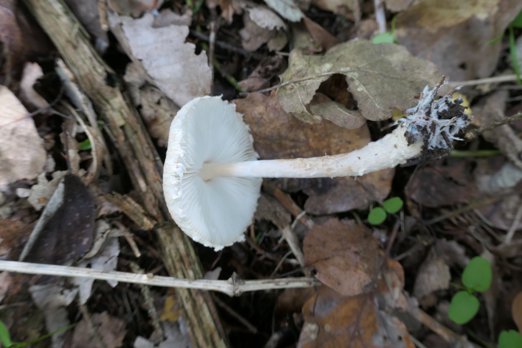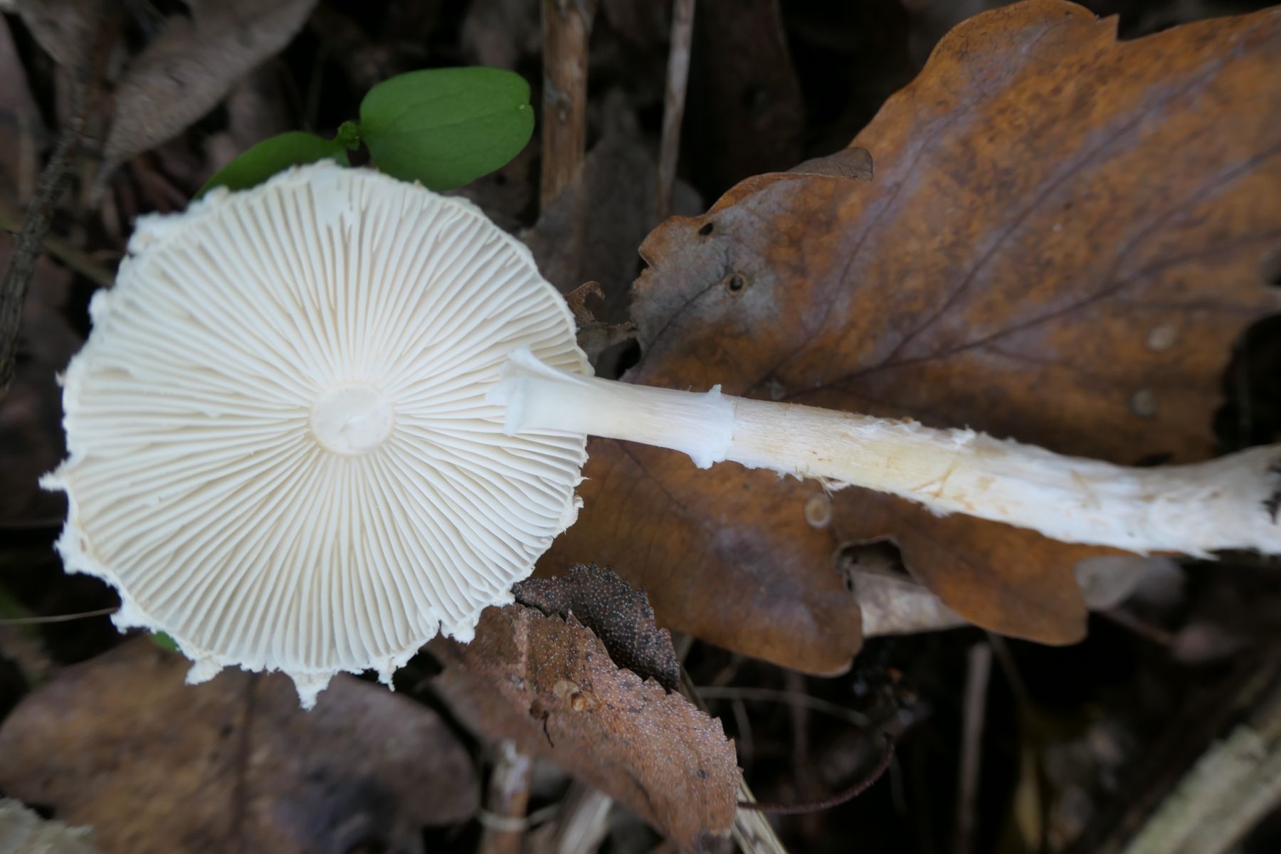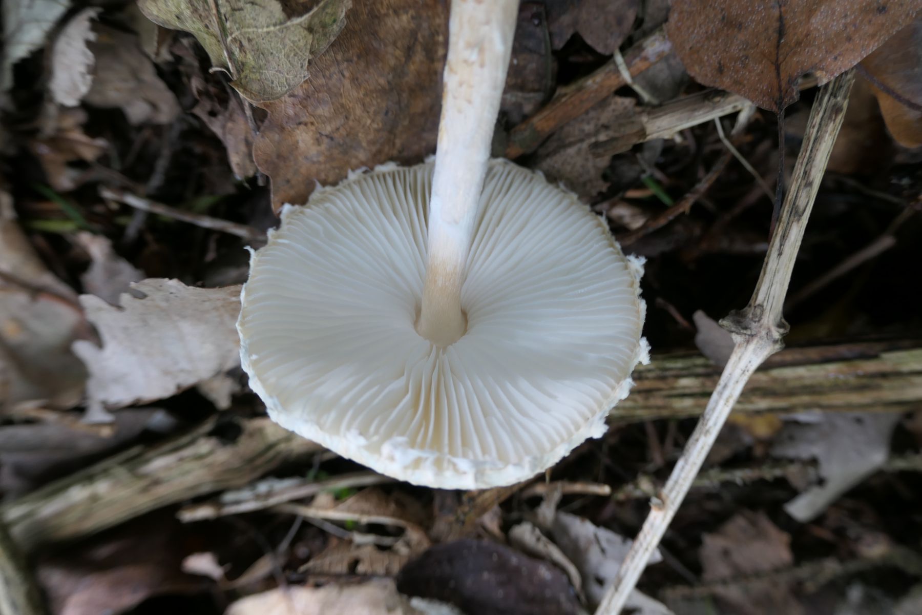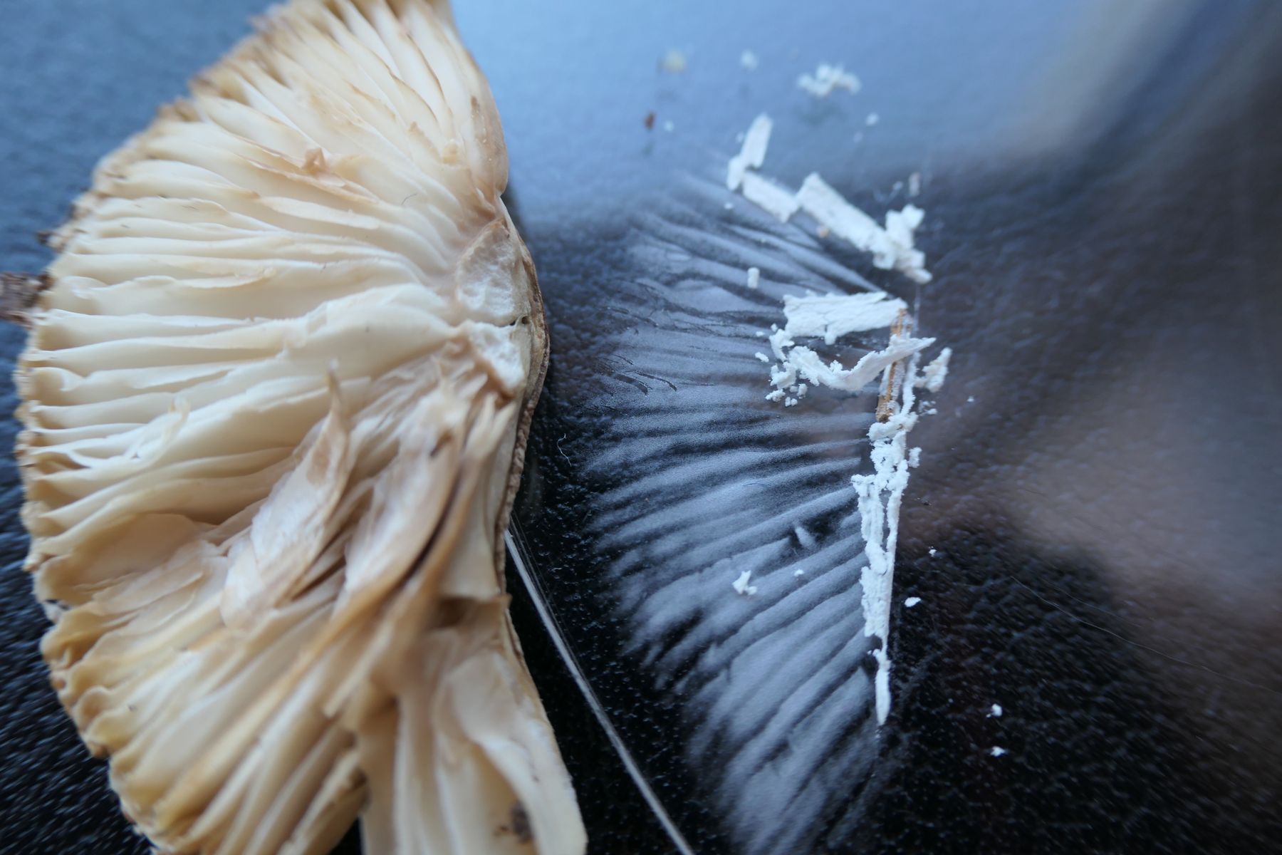 weiße Lamellen sind frei, die Schneiden flockig, Sporenpulver weißlich