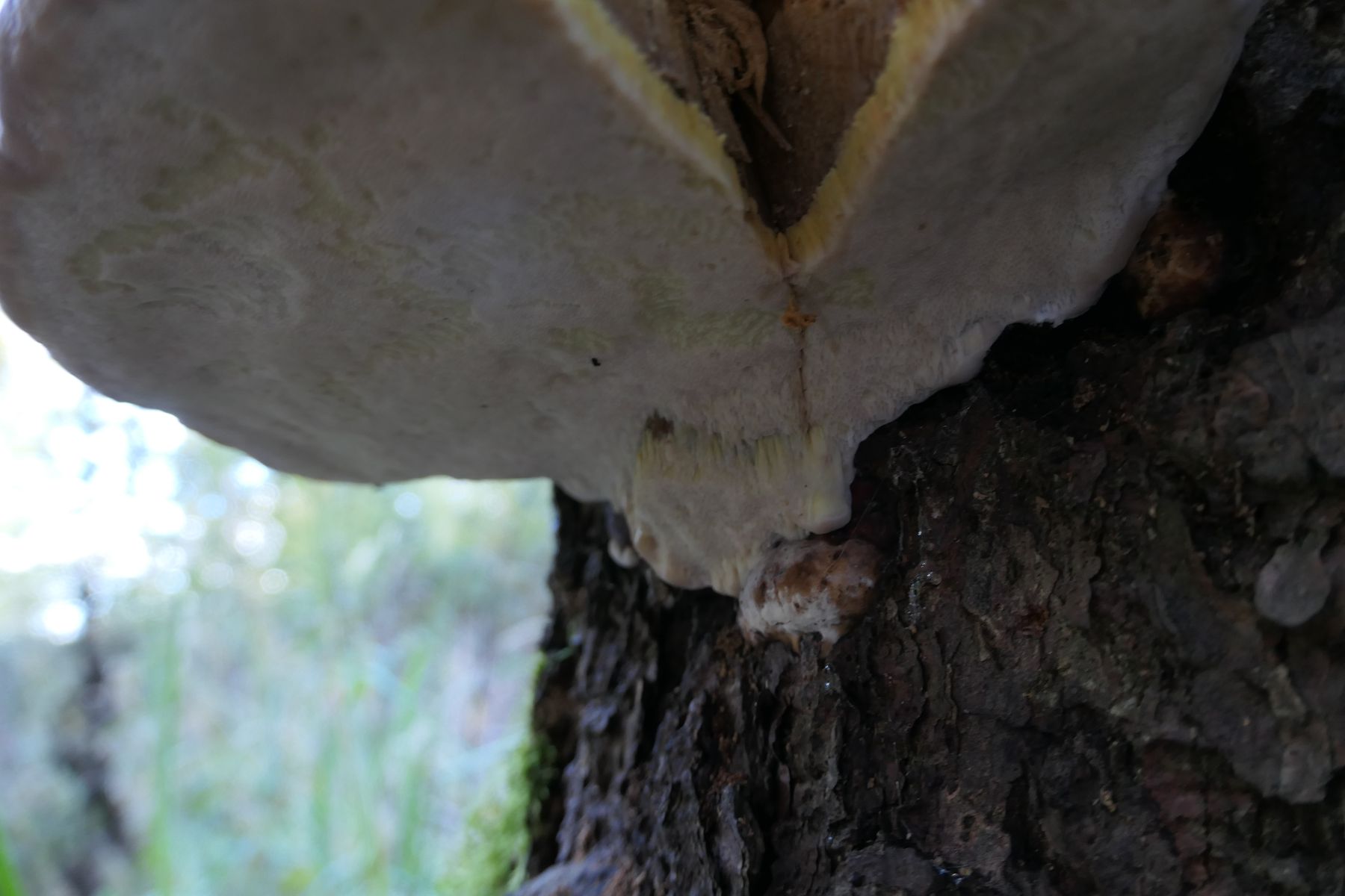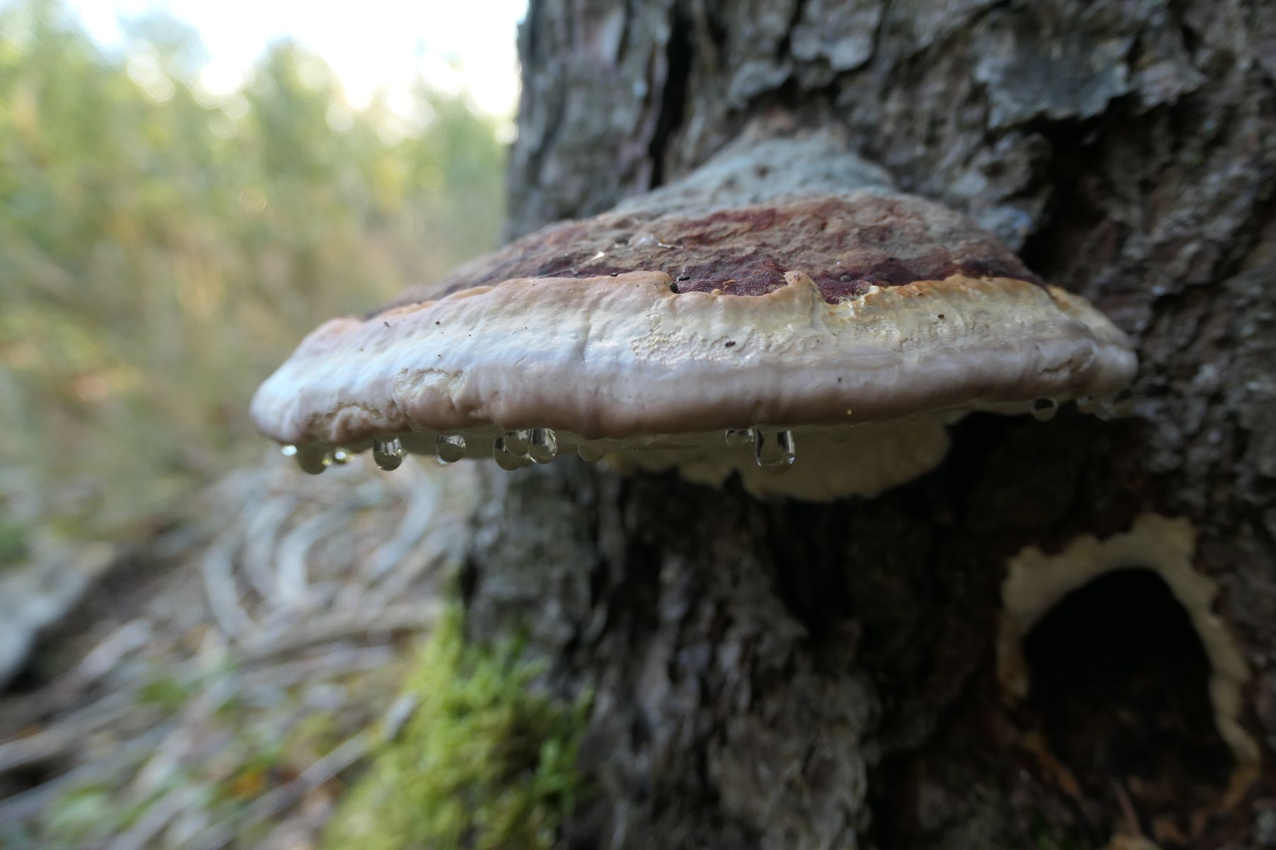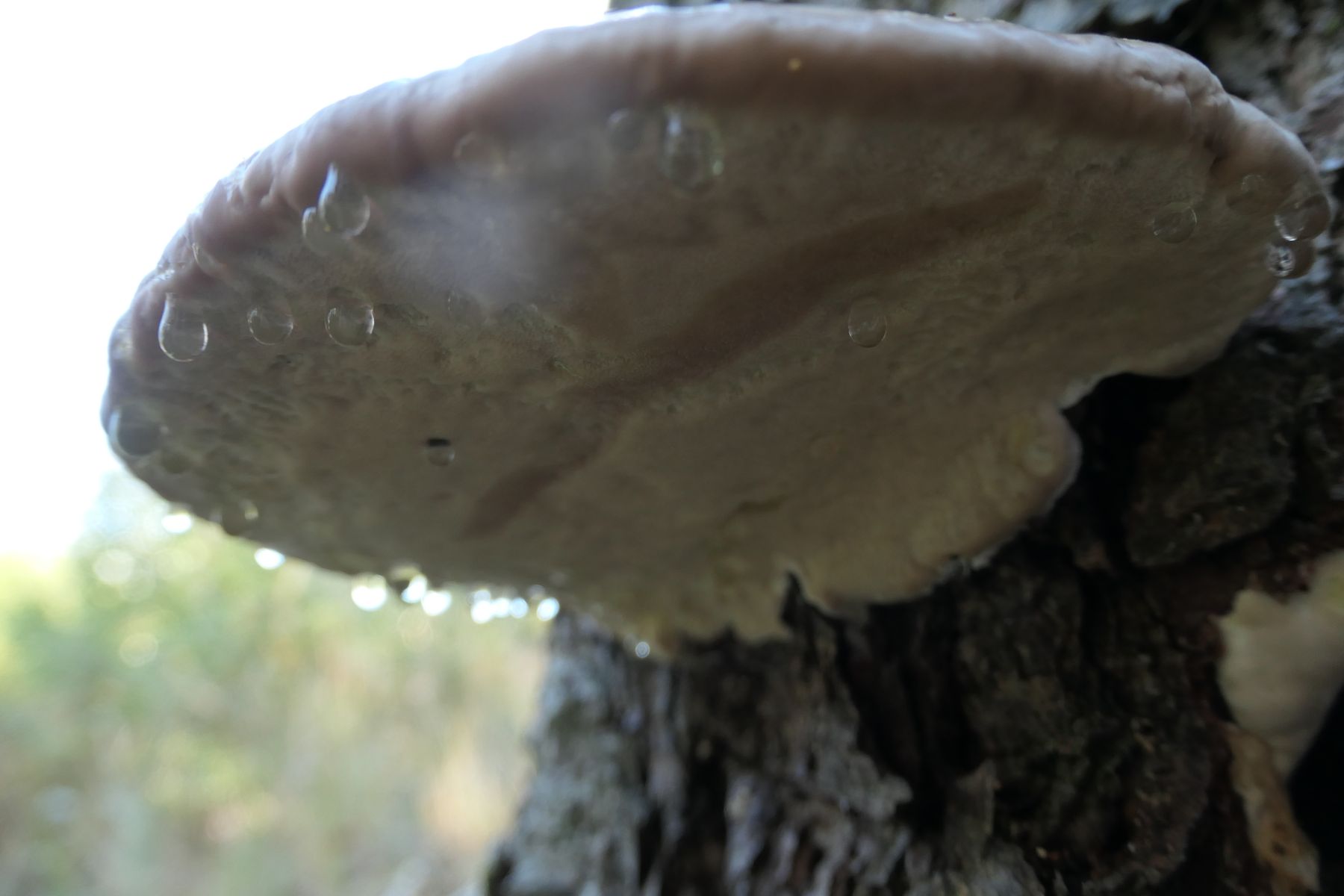 zahlreiche Tröpfchen (Guttation) an der Wachstumszone und am Hymenium
