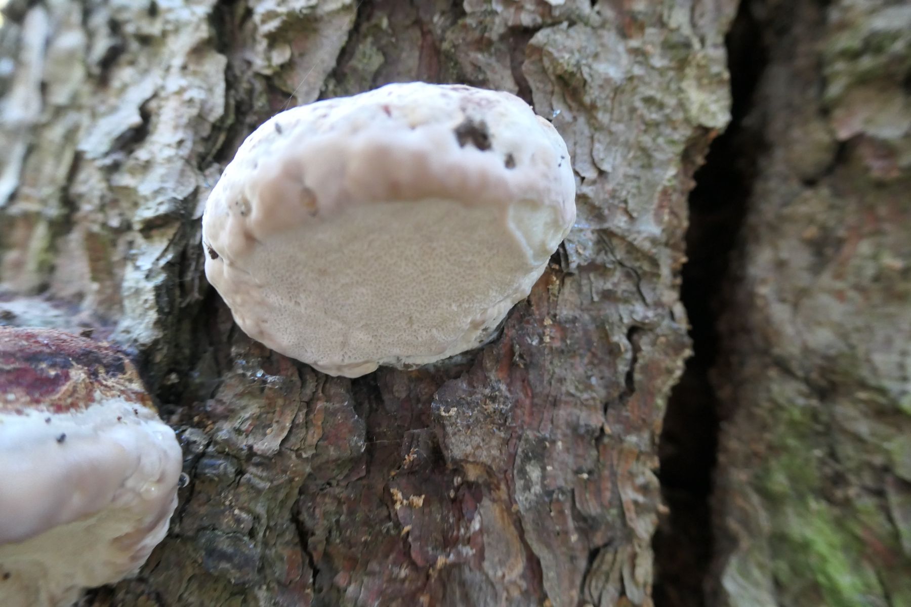 Oberfläche ist weißlich-cremefarben und mit kleinen, blass bräunlichen, wolligen Schüppchen bedeckt; Mitte ist blass bräunlich