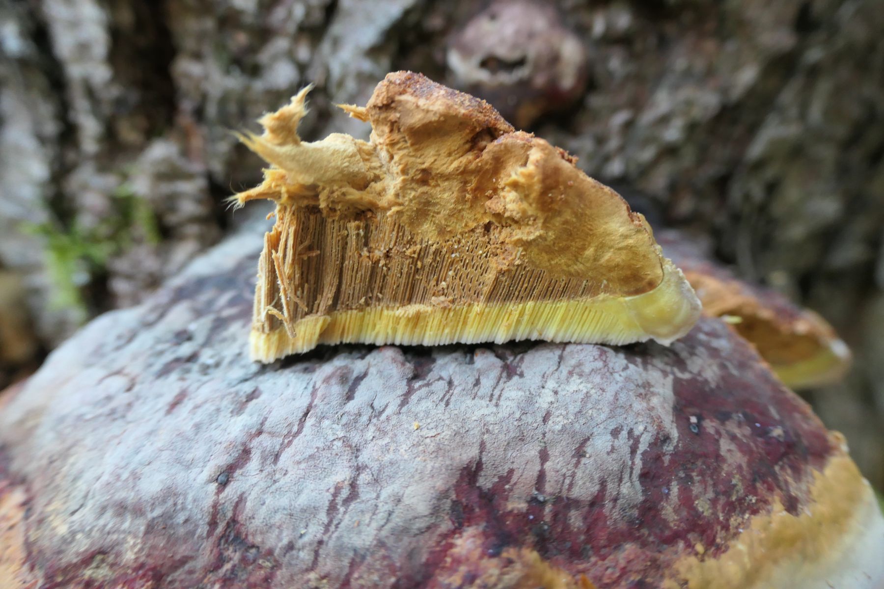 Oberseite aus harter Kruste, Färbung orange, rotbraun, äußerste Zone gelb-weiß