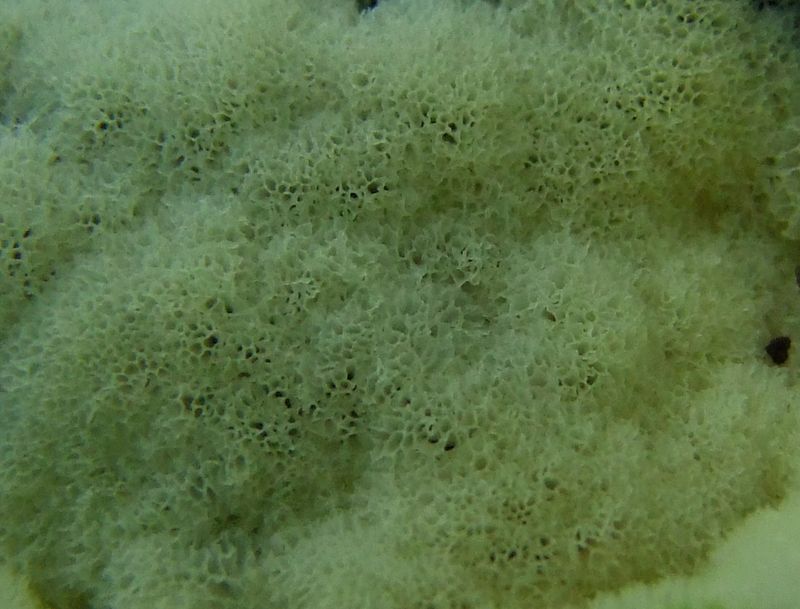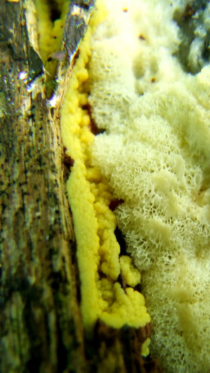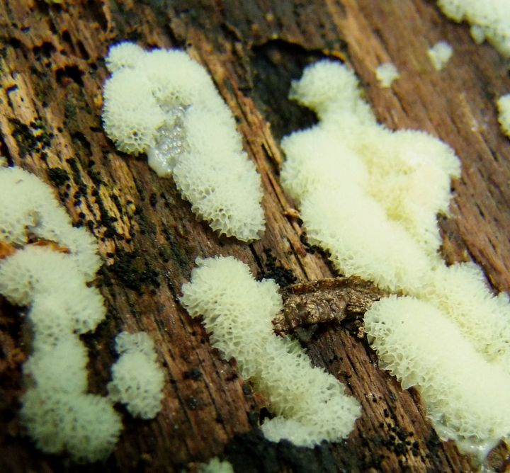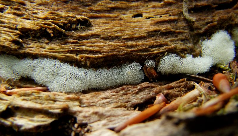 Das erinnert mich sehr stark an die Wabenform des Geweihförmigen Schleimpilzes (Ceratiomyxa fruticulosa var. poroides), auch Weißes Netzpolster genannt, die ich kürzlich im Internet gesehen habe (siehe hier). Ich halte es für wahrscheinlich, dass er es ist, absolut sicher bin ich jedoch nicht.