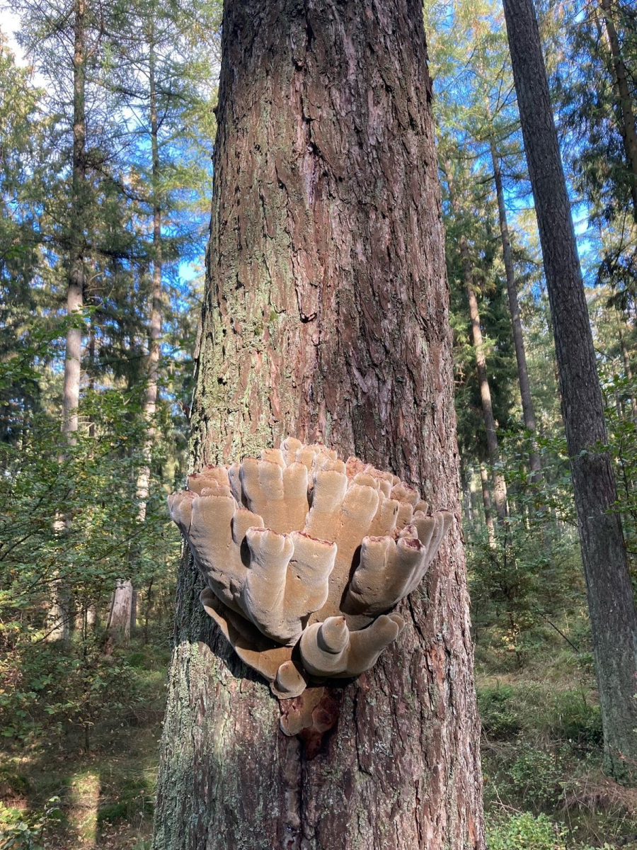 heute war nochmal jemand vom dortigen Forst dort - der Pilz wächst in 2,10 m Höhe in der Stammwunde einer vitalen Lärche und mißt ca 40x40 cm! Wir haben noch weitere Bilder bekommen und ich denke, dass man nun sagen kann, dass es Phaeolus schweinitzii ist ..... aber echt krass, wie der wachsen kann!