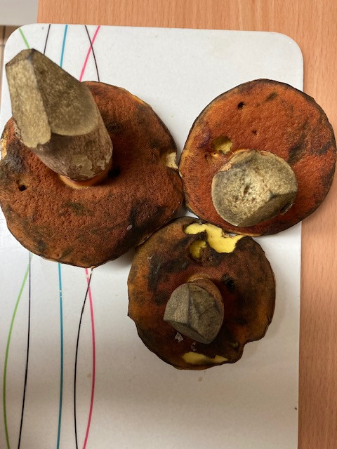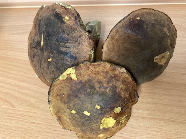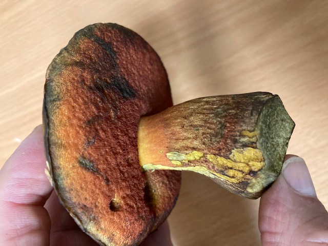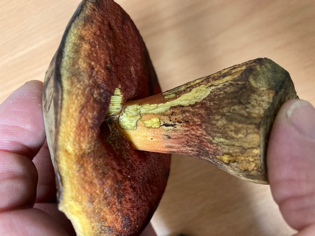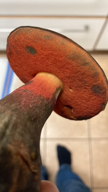 Hallo zusammen, ich bin mir ziemlich sicher, dass es sich hier um flockenstieliege Hexenröhrlinge handelt. Allerdings tu ich mich aufgrund der schrillen Farben sehr schwer den ersten Biß zu machen. Es könnte doch auch ein blaufleckender Purpur Röhrling sein?