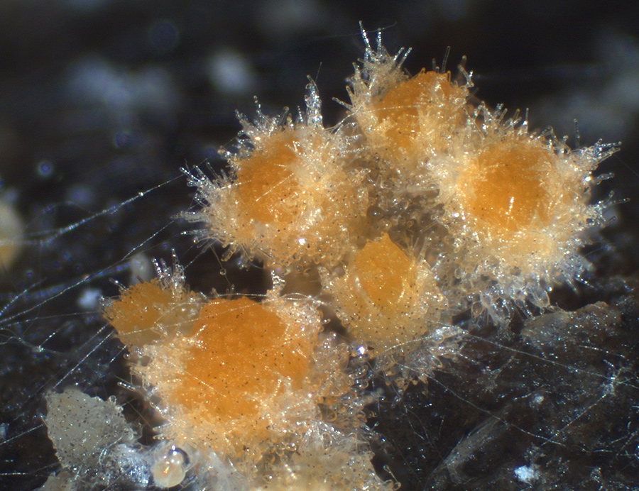 Die rotorangen Apothecien 0,5-1 mm im Durchmesser sind umgeben von hyalinen, dünnwandigen Haaren.