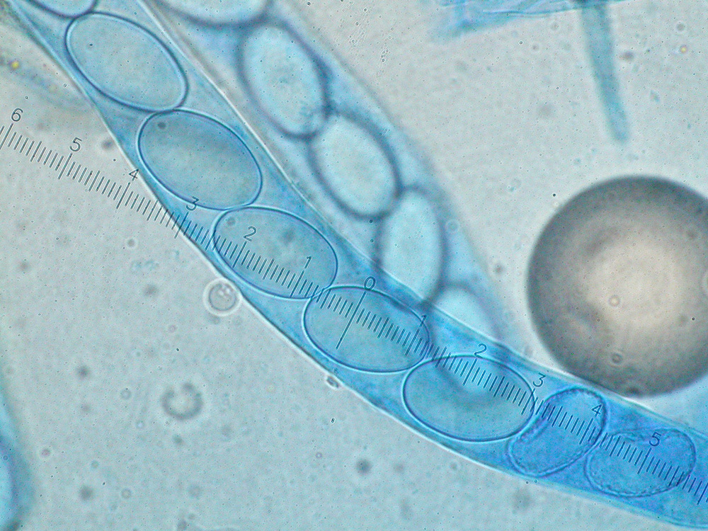 Asci IKI-, 8-sporig, reife, eine Woche alte Sporen elliptisch, glatt auch in Baumwollblau, 20-22 x 11-13 µm. Die Paraphysen mit kleinen gelblichen Vakuolen, an der Spitze kaum verdickt.