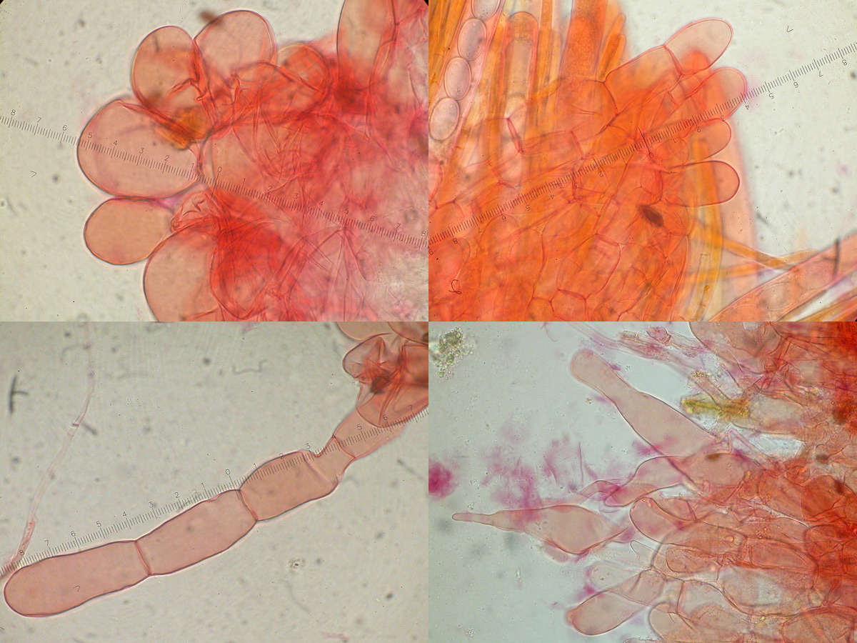 Mikroskopisch bestehen die Randzellen aus kurzgliedrigen Zellen, welche zusammen bis 200 µm lang werden können. Die Haare, wenn das welche sind, sind dünnwandig, vielgestaltig,