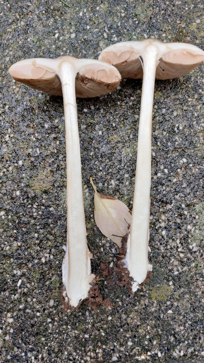 Stiel ringlose, weiß, zylindrisch 15 cm × 1 cm, fasrig; Druckstellen leicht braun; Basis des Stiels etwas verdickt mit häutiger weißer Volva