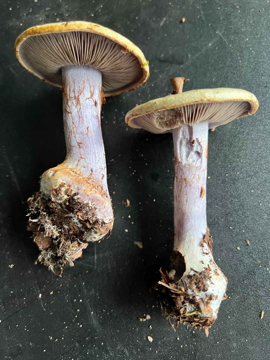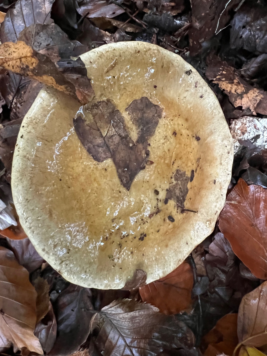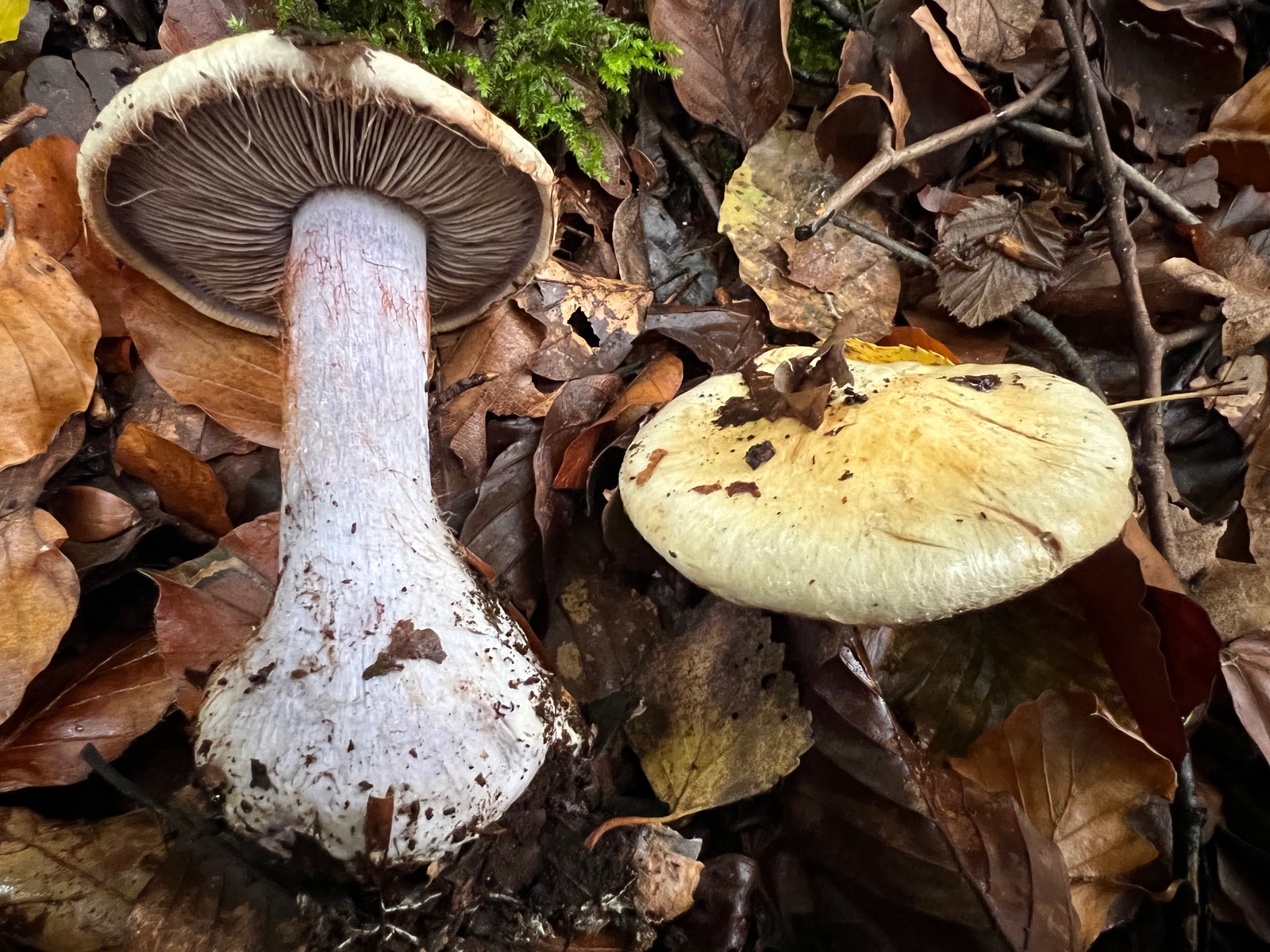 Schau mal ob die Sporen zum Buchen-Klumpfuß (Cortinarius anserinus) passen.
