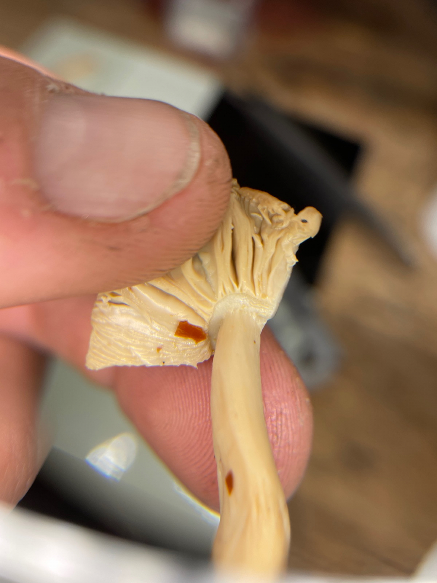 So wie es aussieht, sind die Lamellen komplett frei und nicht am Stiel angewachsen? Vom Habitus des Pilzes würde ich bei den Dachpilzen mal gucken. Die können diese zugespitzten Cheilozystiden haben und ebenfalls solchen geformten Sporen. Vielleicht ist das auch ein Scheidling. Soweit ich weiß, sind einige Scheidlinge und Dachpilze essbar, aber ich hab noch nie welche bewusst gegessen.
