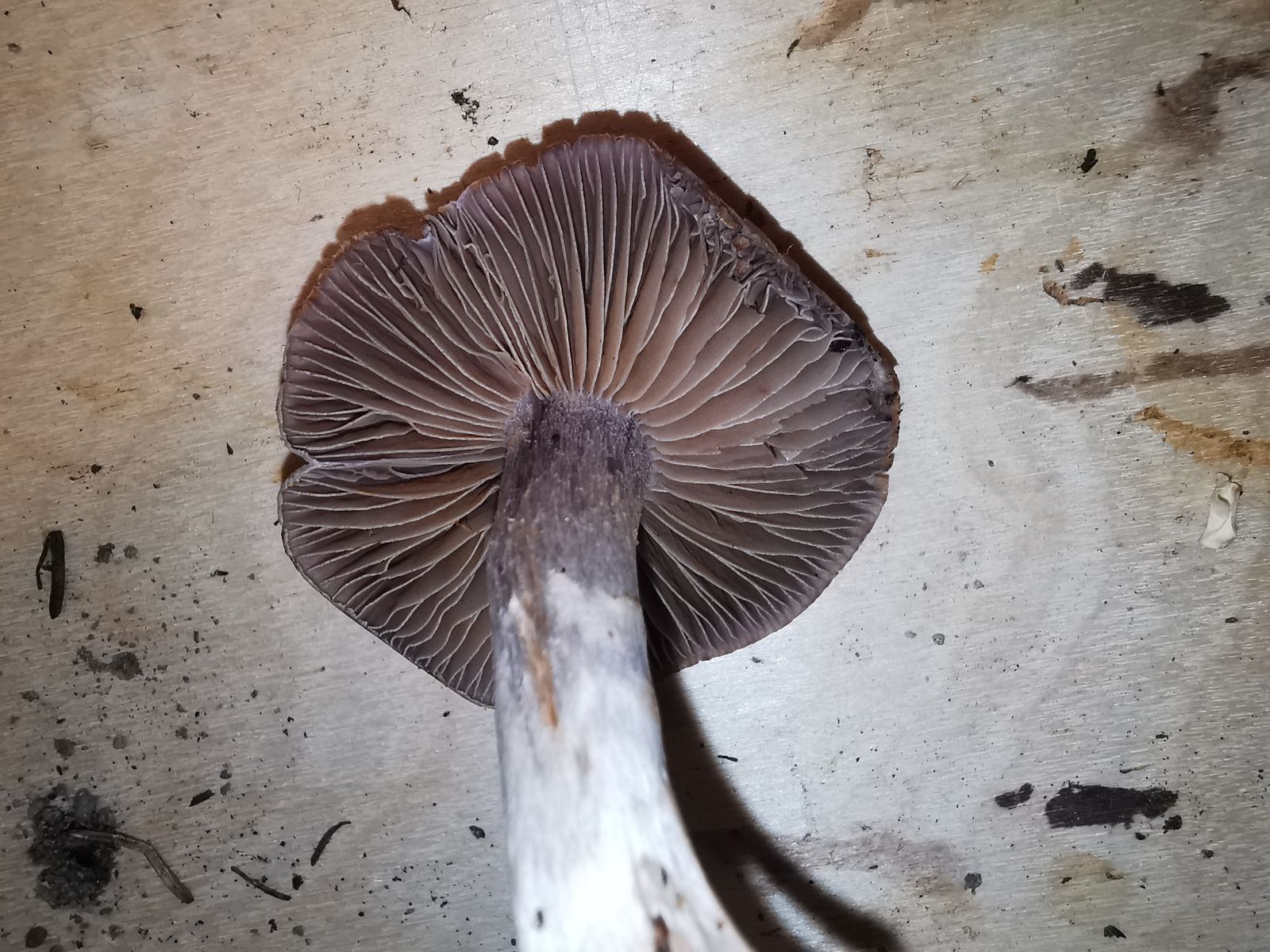 Den zweiten habe ich auch wieder versucht zu schlüsseln, aber ich bin wieder einige Male falsch abgebogen. Bei der Frage nach der Velumfarbe kam ich nicht auf gelbocker. Auf Bild 2b meine ich zwar leichte gelbliche Töne zu sehen, aber das ist mir erst jetzt aufgefallen. Bei der Untersuchung mit einer Lupe konnte ich nichts gelbliches sehen. Ich tue mich oft wirklich sehr schwer dabei bei der Beurteilung der Velumfarbe. Habe ich sie vielleicht beim Entnehmen des Pilzes abgewischt, dass ich sie gar nicht mehr sehen konnte? Habt ihr vielleicht ein paar Tipps? Zudem ist mir auch noch die Stielbasis abgebrochen, da sie wirklich sehr brüchig war. Den Geruch konnte ich nicht genau beschreiben, aber ich empfand ihn als unangenehm. Jedenfalls kam ich nach einer Weile zum Braunvioletten Dickfuss - Cortinarius anomalus agg. (agg. aufgrund von Uwes Hinweis hinzugefügt).
